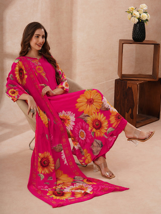 Solid Ethnic Embroidered Straight Kurta with Pant and Dupatta - Pink Solid Ethnic Embroidered Straight Kurta with Pant...
