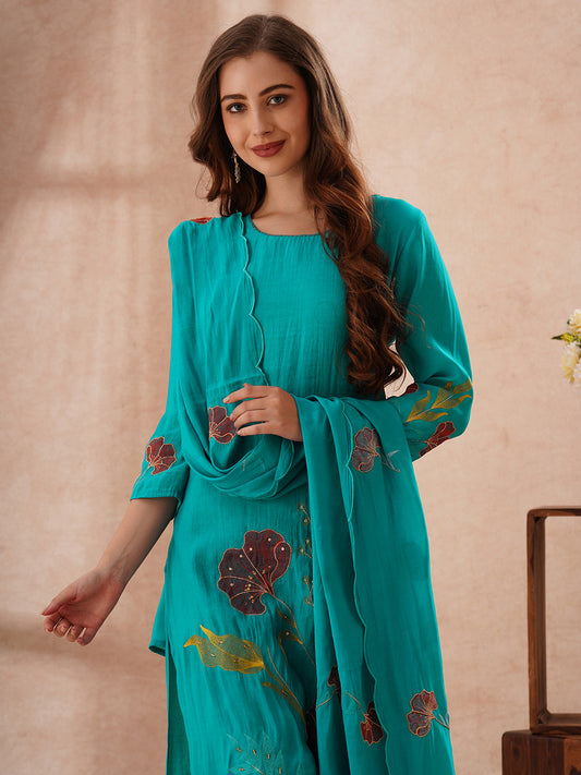 Ethnic Printed Straight Fit Kurta with Pant & Dupatta - Turquoise Blue Ethnic Printed Straight Fit Kurta with Pant...