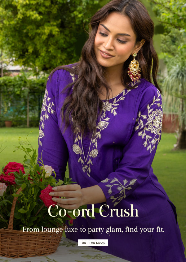 MRP (Inclusive of all taxes)Regular price ₹ 1,899.00₹ 1,899.00 Regular priceUnit price / per₹ 4,799.00Sale priceSale{"id":7733575057494,"title":"Solid Ethnic Embroidered A-Line Co-ord Set - Purple","handle":"solid-ethnic-embroidered-a-line-co-ord-set-purple","description":"\u003ch1\u003eHighlights\u003c\/h1\u003e\n\u003cp\u003e\u003cbr\u003e\u003cbr\u003e-Make a statement in this rich purple viscose-rayon co-ord set, crafted in an elegant A-line silhouette. The mandarin collar brings a touch of refined charm, while intricate threadwork embroidery adds a graceful ethnic allure. A perfect blend of sophistication and easy contemporary style.\u003c\/p\u003e\n\u003ch1\u003e\n\u003cbr\u003eFabric \u0026amp; Colour\u003c\/h1\u003e\n\u003cp\u003e\u003cbr\u003eTop Colour: Purple\u003cbr\u003eTop Fabric: Viscose Rayon\u003cbr\u003eBottom Colour: Purple\u003cbr\u003eBottom Fabric: Viscose Rayon\u003c\/p\u003e\n\u003ch1\u003eSpecifications\u003c\/h1\u003e\n\u003cp\u003e\u003cbr\u003eTop Design: Solid\u003cbr\u003eTop Craft: Embroidery, Plain and Prints\u003cbr\u003eTop Shape: A-line\u003cbr\u003eNeck: Mandarin Collar\u003cbr\u003eSleeve Length: Three-Quarter Sleeves\u003cbr\u003eTop Length: Calf Length\u003cbr\u003eHemline: Flared\u003cbr\u003e\u003c\/p\u003e\n\u003cp\u003eBottom Type: Palazzos\u003cbr\u003eBottom Closure: Slip-On\u003cbr\u003eWaistband: Elasticated\u003c\/p\u003e\n\u003cp\u003eWash Care: Machine Wash\u003c\/p\u003e\n\u003cp\u003eLength (in inches)\u003cbr\u003eKurta – 45, Sleeves – 17,\u003cbr\u003eBottom - 40\u003c\/p\u003e\n\u003cp\u003eModel’s Height: 5’7”. Wearing Size S.\u003c\/p\u003e\n\u003ch1\u003eProduct Information\u003c\/h1\u003e\n\u003cp\u003e\u003cbr\u003eManufactured\/Packed\/Marketed By:\u003cbr\u003eFashor Lifestyle Pvt. Ltd.\u003cbr\u003e28\/30, Sudarshanpura Industrial Area,\u003cbr\u003eJaipur - 302006.\u003cbr\u003eCountry of Origin: India\u003c\/p\u003e","published_at":"2025-12-11T13:40:40+05:30","created_at":"2025-12-11T13:08:36+05:30","vendor":"FASHOR","type":"2P Kurta Set","tags":["1001-2000","2XL","31916","3XL","All Styles","co-ord","colour_purple","craft_embroidery","craft_plain-and-prints","design_solid","fabric_viscose-rayon","KURTI","kurtis","L","M","meta-size-chart-","now-trending","shape_a-line","workwear","XL"],"price":189900,"price_min":189900,"price_max":189900,"available":true,"price_varies":false,"compare_at_price":479900,"compare_at_price_min":479900,"compare_at_price_max":479900,"compare_at_price_varies":false,"variants":[{"id":43727017738326,"title":"M","option1":"M","option2":null,"option3":null,"sku":"38-KB031916G5FS","requires_shipping":true,"taxable":true,"featured_image":{"id":35861815656534,"product_id":7733575057494,"position":2,"created_at":"2025-12-11T13:09:11+05:30","updated_at":"2025-12-11T13:10:50+05:30","alt":null,"width":1080,"height":1440,"src":"\/\/fashor.com\/cdn\/shop\/files\/32898_1.jpg?v=1765438850","variant_ids":[43727017738326,43727017771094,43727017803862,43727017836630,43727017869398]},"available":true,"name":"Solid Ethnic Embroidered A-Line Co-ord Set - Purple - M","public_title":"M","options":["M"],"price":189900,"weight":0,"compare_at_price":479900,"inventory_quantity":6,"inventory_management":"shopify","inventory_policy":"deny","barcode":"","featured_media":{"alt":null,"id":27939647914070,"position":2,"preview_image":{"aspect_ratio":0.75,"height":1440,"width":1080,"src":"\/\/fashor.com\/cdn\/shop\/files\/32898_1.jpg?v=1765438850"}},"requires_selling_plan":false,"selling_plan_allocations":[],"quantity_rule":{"min":1,"max":null,"increment":1}},{"id":43727017771094,"title":"L","option1":"L","option2":null,"option3":null,"sku":"40-KB031916G5FS","requires_shipping":true,"taxable":true,"featured_image":{"id":35861815656534,"product_id":7733575057494,"position":2,"created_at":"2025-12-11T13:09:11+05:30","updated_at":"2025-12-11T13:10:50+05:30","alt":null,"width":1080,"height":1440,"src":"\/\/fashor.com\/cdn\/shop\/files\/32898_1.jpg?v=1765438850","variant_ids":[43727017738326,43727017771094,43727017803862,43727017836630,43727017869398]},"available":true,"name":"Solid Ethnic Embroidered A-Line Co-ord Set - Purple - L","public_title":"L","options":["L"],"price":189900,"weight":0,"compare_at_price":479900,"inventory_quantity":7,"inventory_management":"shopify","inventory_policy":"deny","barcode":"","featured_media":{"alt":null,"id":27939647914070,"position":2,"preview_image":{"aspect_ratio":0.75,"height":1440,"width":1080,"src":"\/\/fashor.com\/cdn\/shop\/files\/32898_1.jpg?v=1765438850"}},"requires_selling_plan":false,"selling_plan_allocations":[],"quantity_rule":{"min":1,"max":null,"increment":1}},{"id":43727017803862,"title":"XL","option1":"XL","option2":null,"option3":null,"sku":"42-KB031916G5FS","requires_shipping":true,"taxable":true,"featured_image":{"id":35861815656534,"product_id":7733575057494,"position":2,"created_at":"2025-12-11T13:09:11+05:30","updated_at":"2025-12-11T13:10:50+05:30","alt":null,"width":1080,"height":1440,"src":"\/\/fashor.com\/cdn\/shop\/files\/32898_1.jpg?v=1765438850","variant_ids":[43727017738326,43727017771094,43727017803862,43727017836630,43727017869398]},"available":true,"name":"Solid Ethnic Embroidered A-Line Co-ord Set - Purple - XL","public_title":"XL","options":["XL"],"price":189900,"weight":0,"compare_at_price":479900,"inventory_quantity":7,"inventory_management":"shopify","inventory_policy":"deny","barcode":"","featured_media":{"alt":null,"id":27939647914070,"position":2,"preview_image":{"aspect_ratio":0.75,"height":1440,"width":1080,"src":"\/\/fashor.com\/cdn\/shop\/files\/32898_1.jpg?v=1765438850"}},"requires_selling_plan":false,"selling_plan_allocations":[],"quantity_rule":{"min":1,"max":null,"increment":1}},{"id":43727017836630,"title":"2XL","option1":"2XL","option2":null,"option3":null,"sku":"44-KB031916G5FS","requires_shipping":true,"taxable":true,"featured_image":{"id":35861815656534,"product_id":7733575057494,"position":2,"created_at":"2025-12-11T13:09:11+05:30