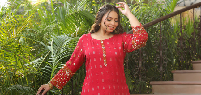 MRP (Inclusive of all taxes)Regular price ₹ 2,599.00₹ 2,599.00 Regular priceUnit price / per₹ 2,599.00Sale price{"id":7710574051414,"title":"Festive Ethnic Mirror Embroidered Kaftan Kurta with Pant - Red","handle":"festive-ethnic-mirror-embroidered-kaftan-kurta-with-pant-red","description":"\u003ch1\u003eHighlights\u003c\/h1\u003e\n\u003cp\u003e\u003cbr\u003e\u003cbr\u003e-Crafted from flowy Muslin Silk fabric, this ensemble features a flattering round neckline, delicate mirror embroidery that radiate elegance. Paired with matching Pant , it’s the perfect blend of comfort and celebration-ready charm.\u003c\/p\u003e\n\u003ch1\u003e\n\u003cbr\u003eFabric \u0026amp; Colour\u003c\/h1\u003e\n\u003cp\u003e\u003cbr\u003eTop Colour: Red\u003cbr\u003eTop Fabric: Muslin Silk\u003cbr\u003eBottom Colour: Red\u003cbr\u003eBottom Fabric: Muslin Silk\u003c\/p\u003e\n\u003ch1\u003eSpecifications\u003c\/h1\u003e\n\u003cp\u003e\u003cbr\u003eTop Design: Solid\u003cbr\u003eTop Craft: Embroidery, Plain and Prints\u003cbr\u003eTop Shape: Kaftan\u003cbr\u003eNeck: Round Neck\u003cbr\u003eSleeve Length: Three-Quarter Sleeves\u003cbr\u003eTop Length: Calf Length\u003cbr\u003eHemline: Straight\u003cbr\u003eSlit: Side Slits\u003c\/p\u003e\n\u003cp\u003eBottom Type: Pant\u003cbr\u003eBottom Closure: Slip-On\u003cbr\u003eWaistband: Elasticated\u003c\/p\u003e\n\u003cp\u003eWash Care: Hand Wash\u003c\/p\u003e\n\u003cp\u003eLength (in inches)\u003cbr\u003eKurta – 39, Sleeveless,\u003cbr\u003eBottom - 46\u003c\/p\u003e\n\u003cp\u003eModel’s Height: 5’7”. Wearing Size S.\u003c\/p\u003e\n\u003ch1\u003eProduct Information\u003c\/h1\u003e\n\u003cp\u003e\u003cbr\u003eManufactured\/Packed\/Marketed By:\u003cbr\u003eFashor Lifestyle Pvt. Ltd.\u003cbr\u003e28\/30, Sudarshanpura Industrial Area,\u003cbr\u003eJaipur - 302006.\u003cbr\u003eCountry of Origin: India\u003c\/p\u003e","published_at":"2025-11-15T14:41:24+05:30","created_at":"2025-11-15T13:52:23+05:30","vendor":"FASHOR","type":"2P Kurta Set","tags":["2001-3000","2XL","32333","All Styles","colour_red","craft_embroidery","craft_plain-and-prints","design_solid","fabric_muslin-silk","KURTI","kurtis","L","meta-size-chart-","now-trending","occasionwear","shape_kaftan","XL"],"price":259900,"price_min":259900,"price_max":259900,"available":true,"price_varies":false,"compare_at_price":259900,"compare_at_price_min":259900,"compare_at_price_max":259900,"compare_at_price_varies":false,"variants":[{"id":43637008269398,"title":"M","option1":"M","option2":null,"option3":null,"sku":"38-KB032333G5FS","requires_shipping":true,"taxable":true,"featured_image":{"id":35658086547542,"product_id":7710574051414,"position":3,"created_at":"2025-11-15T13:52:52+05:30","updated_at":"2025-11-15T13:53:53+05:30","alt":null,"width":1080,"height":1440,"src":"\/\/fashor.com\/cdn\/shop\/files\/32761_1.jpg?v=1763195033","variant_ids":[43637008269398,43637008302166,43637008334934,43637008367702]},"available":false,"name":"Festive Ethnic Mirror Embroidered Kaftan Kurta with Pant - Red - M","public_title":"M","options":["M"],"price":259900,"weight":0,"compare_at_price":259900,"inventory_quantity":0,"inventory_management":"shopify","inventory_policy":"deny","barcode":"","featured_media":{"alt":null,"id":27742000218198,"position":3,"preview_image":{"aspect_ratio":0.75,"height":1440,"width":1080,"src":"\/\/fashor.com\/cdn\/shop\/files\/32761_1.jpg?v=1763195033"}},"requires_selling_plan":false,"selling_plan_allocations":[],"quantity_rule":{"min":1,"max":null,"increment":1}},{"id":43637008302166,"title":"L","option1":"L","option2":null,"option3":null,"sku":"40-KB032333G5FS","requires_shipping":true,"taxable":true,"featured_image":{"id":35658086547542,"product_id":7710574051414,"position":3,"created_at":"2025-11-15T13:52:52+05:30","updated_at":"2025-11-15T13:53:53+05:30","alt":null,"width":1080,"height":1440,"src":"\/\/fashor.com\/cdn\/shop\/files\/32761_1.jpg?v=1763195033","variant_ids":[43637008269398,43637008302166,43637008334934,43637008367702]},"available":true,"name":"Festive Ethnic Mirror Embroidered Kaftan Kurta with Pant - Red - L","public_title":"L","options":["L"],"price":259900,"weight":0,"compare_at_price":259900,"inventory_quantity":1,"inventory_management":"shopify","inventory_policy":"deny","barcode":"","featured_media":{"alt":null,"id":27742000218198,"position":3,"preview_image":{"aspect_ratio":0.75,"height":1440,"width":1080,"src":"\/\/fashor.com\/cdn\/shop\/files\/32761_1.jpg?v=1763195033"}},"requires_selling_plan":false,"selling_plan_allocations":[],"quantity_rule":{"min":1,"max":null,"increment":1}},{"id":43637008334934,"title":"XL","option1":"XL","option2":null,"option3":null,"sku":"42-KB032333G5FS","requires_shipping":true,"taxable":true,"featured_image":{"id":35658086547542,"product_id":7710574051414,"position":3,"created_at":"2025-11-15T13:52:52+05:30","updated_at":"2025-11-15T13:53:53+05:30","alt":null,"width":1080,"height":1440,"src":"\/\/fashor.com\/cdn\/shop\/files\/32761_1.jpg?v=1763195033","variant_ids":[43637008269398,43637008302166,43637008334934,43637008367702]},"available":true,"name":"Festive Ethnic Mirror Embroidered Kaftan Kurta with Pant - Red - XL","public_title":"XL","options":["XL"],"price":259900,"weight":0,"compare_at_price":259900,"inventory_quantity":3,"inventory_management":"shopify","inventory_policy":"deny","barcode":"","featured_media":{"alt":null,"id":27742000218198,"position":3,"preview_image":{"aspect_ratio":0.75,"height":1440,"width":1080,"src":"\/\/fashor.com\/cdn\/shop\/files\/32761_1.jpg?v=1763195033"}},"requires_selling_plan":false,"selling_plan_allocations":[],"quantity_rule":{"min":1,"max":null,"increment":1}},{"id":43637008367702,"title":"2XL","option1":"2XL","option2":null,"option3":null,"sku":"44-KB032333G5FS","requires_shipping":true,"taxable":true,"featured_image":{"id":35658086547542,"product_id":7710574051414,"position":3,"created_at":"2025-11-15T13:52:52+05:30","updated_at":"2025-11-15T13:53:53+05:30","alt":null,"width":1080,"height":