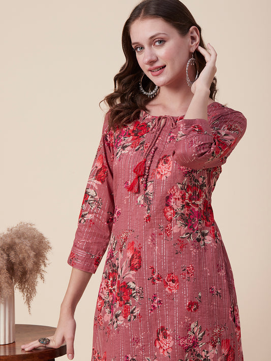 Floral Printed Woven Lurex Striped Pin-Tucks Kurta...