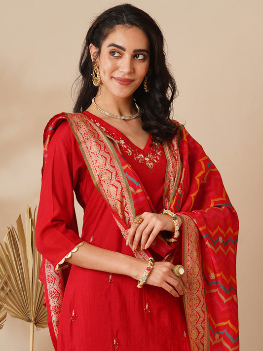 MRP (Inclusive of all taxes)Regular price ₹ 2,549.00₹ 2,549.00 Regular priceUnit price / per₹ 6,399.00Sale priceM L XL 2XL sold outSold out{"id":7425364099158,"title":"Solid Ethnic Hand Embroidered Straight Fit Kurta with Pant \u0026 Dupatta - Red","handle":"solid-ethnic-hand-embroidered-straight-fit-kurta-with-pant-dupatta-red-1","description":"\u003ch1\u003eHighlights\u003c\/h1\u003e\n\u003cp\u003e\u003cbr\u003e-Straight Fit Kurta\u003cbr\u003e-Ethnic Embroidered at Front\u003cbr\u003e-Comes with Floral Printed Dupatta\u003c\/p\u003e\n\u003ch1\u003eFabric \u0026amp; Colour\u003c\/h1\u003e\n\u003cp\u003e\u003cbr\u003eTop Colour: Red\u003cbr\u003eTop Fabric: Muslin Silk\u003cbr\u003eBottom Colour: Red\u003cbr\u003eBottom Fabric: Muslin Silk\u003cbr\u003eDupatta Colour: Red\u003cbr\u003eDupatta Fabric: Muslin Silk\u003c\/p\u003e\n\u003ch1\u003eSpecifications\u003c\/h1\u003e\n\u003cp\u003e\u003cbr\u003eTop Design: Solid\u003cbr\u003eTop Craft: Embroidery, Plain and Prints\u003cbr\u003eTop Shape: Straight\u003cbr\u003eNeck: V-Neck\u003cbr\u003eSleeve Length: Three-Quarter Sleeves\u003cbr\u003eTop Length: Calf Length\u003cbr\u003eHemline: Straight\u003cbr\u003eSlit: Side Slits\u003c\/p\u003e\n\u003cp\u003eBottom Type: Trousers\u003cbr\u003eBottom Closure: Slip-On\u003cbr\u003eWaistband: Partially Elasticated\u003c\/p\u003e\n\u003cp\u003eDupatta Pattern: Printed\u003cbr\u003eDupatta Border: Printed\u003c\/p\u003e\n\u003cp\u003eWash Care: Hand Wash\u003c\/p\u003e\n\u003cp\u003eMeasurement (in inches)\u003cbr\u003eLength – 46, Sleeves – 17,\u003cbr\u003eBottom – 40\u003c\/p\u003e\n\u003cp\u003eModel’s Height: 5’7”. Wearing Size S.\u003c\/p\u003e\n\u003ch1\u003eProduct Information\u003c\/h1\u003e\n\u003cp\u003e\u003cbr\u003eManufactured\/Packed\/Marketed By:\u003cbr\u003eFashor Lifestyle Pvt. Ltd.\u003cbr\u003e28\/30, Sudarshanpura Industrial Area,\u003cbr\u003eJaipur - 302006.\u003cbr\u003eCountry of Origin: India\u003c\/p\u003e","published_at":"2024-10-15T15:52:10+05:30","created_at":"2024-10-15T14:19:12+05:30","vendor":"FASHOR","type":"3P Kurta Set","tags":["2001-3000","25928","All Styles","bogo-zone","casualwear","colour_red","craft_embroidery","craft_plain-and-prints","design_solid","fabric_muslin-silk","festivewear","KURTI","kurtis","meta-size-chart-","monsoo","rakhi","rakhi-favourites","shape_straight"],"price":254900,"price_min":254900,"price_max":254900,"available":false,"price_varies":false,"compare_at_price":639900,"compare_at_price_min":639900,"compare_at_price_max":639900,"compare_at_price_varies":false,"variants":[{"id":41812972568662,"title":"M","option1":"M","option2":null,"option3":null,"sku":"38-STA25928I4FS","requires_shipping":true,"taxable":false,"featured_image":{"id":33483070832726,"product_id":7425364099158,"position":3,"created_at":"2024-10-15T14:19:28+05:30","updated_at":"2025-06-09T19:53:32+05:30","alt":null,"width":1080,"height":1440,"src":"\/\/fashor.com\/cdn\/shop\/files\/28130_7.jpg?v=1749479012","variant_ids":[41812972568662,41812972601430,41812972634198,41812972666966]},"available":false,"name":"Solid Ethnic Hand Embroidered Straight Fit Kurta with Pant \u0026 Dupatta - Red - M","public_title":"M","options":["M"],"price":254900,"weight":0,"compare_at_price":639900,"inventory_quantity":0,"inventory_management":"shopify","inventory_policy":"deny","barcode":null,"featured_media":{"alt":null,"id":26082807545942,"position":3,"preview_image":{"aspect_ratio":0.75,"height":1440,"width":1080,"src":"\/\/fashor.com\/cdn\/shop\/files\/28130_7.jpg?v=1749479012"}},"requires_selling_plan":false,"selling_plan_allocations":[],"quantity_rule":{"min":1,"max":null,"increment":1}},{"id":41812972601430,"title":"L","option1":"L","option2":null,"option3":null,"sku":"40-STA25928I4FS","requires_shipping":true,"taxable":false,"featured_image":{"id":33483070832726,"product_id":7425364099158,"position":3,"created_at":"2024-10-15T14:19:28+05:30","updated_at":"2025-06-09T19:53:32+05:30","alt":null,"width":1080,"height":1440,"src":"\/\/fashor.com\/cdn\/shop\/files\/28130_7.jpg?v=1749479012","variant_ids":[41812972568662,41812972601430,41812972634198,41812972666966]},"available":false,"name":"Solid Ethnic Hand Embroidered Straight Fit Kurta with Pant \u0026 Dupatta - Red - L","public_title":"L","options":["L"],"price":254900,"weight":0,"compare_at_price":639900,"inventory_quantity":0,"inventory_management":"shopify","inventory_policy":"deny","barcode":null,"featured_media":{"alt":null,"id":26082807545942,"position":3,"preview_image":{"aspect_ratio":0.75,"height":1440,"width":1080,"src":"\/\/fashor.com\/cdn\/shop\/files\/28130_7.jpg?v=1749479012"}},"requires_selling_plan":false,"selling_plan_allocations":[],"quantity_rule":{"min":1,"max":null,"increment":1}},{"id":41812972634198,"title":"XL","option1":"XL","option2":null,"option3":null,"sku":"42-STA25928I4FS","requires_shipping":true,"taxable":false,"featured_image":{"id":33483070832726,"product_id":7425364099158,"position":3,"created_at":"2024-10-15T14:19:28+05:30","updated_at":"2025-06-09T19:53:32+05:30","alt":null,"width":1080,"height":1440,"src":"\/\/fashor.com\/cdn\/shop\/files\/28130_7.jpg?v=1749479012","variant_ids":[41812972568662,41812972601430,41812972634198,41812972666966]},"available":false,"name":"Solid Ethnic Hand Embroidered Straight Fit Kurta with Pant \u0026 Dupatta - Red - XL","public_title":"XL","options":["XL"],"price":254900,"weight":0,"compare_at_price":639900,"inventory_quantity":0,"inventory_management":"shopify","inventory_policy":"deny","barcode":null,"featured_media":{"alt":null,"id":26082807545942,"position":3,"preview_image":{"aspect_ratio":0.75,"height":1440,"width":1080,"src":"\/\/fashor.com\/cdn\/shop\/files\/28130_7.jpg?v=1749479012"}},"requires_selling_plan":false,"selling_plan_allocations":[],"quantity_rule":{"min":1,"max":null,"increment":1}},{"id":41812972666966,"title":"2XL","option1":"2XL","option2":null,"option3":null,"sku":"44-STA25928I4FS","requires_shipping":true,"taxable":false,"featur