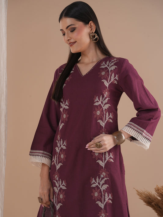 Solid Cross Stitch Embroidered A-Line Kurta with...