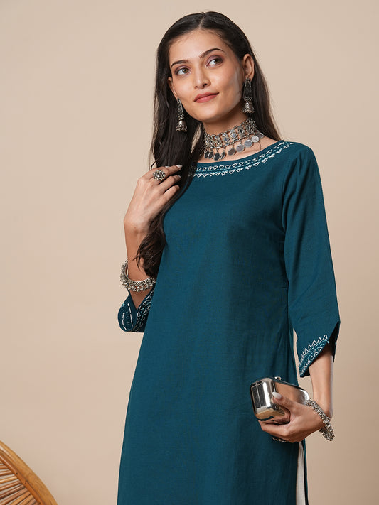 Solid Mirror Embroidered Straight Fit Kurta with...