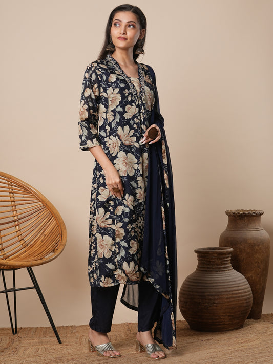 Ethnic Floral Printed & Embroidered Straight Kurta...