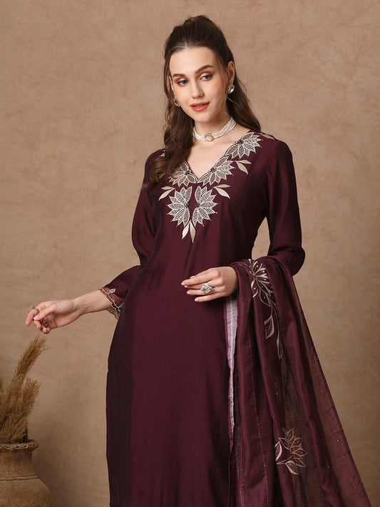 Solid Floral Embroidered Straight Fit Co-ord Set...