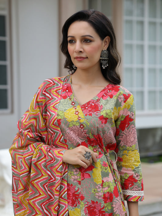 Floral Printed Mirror Embroidered Angrakha Style Kurta...