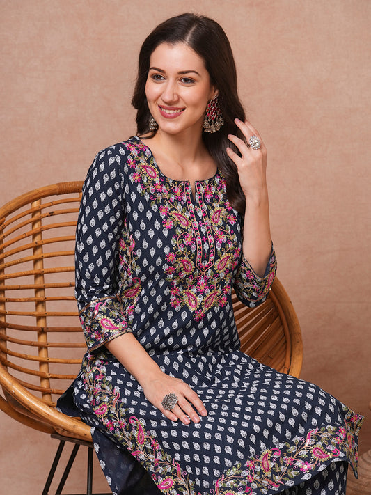 Ethnic Floral Printed & Embroidered Straight Fit...