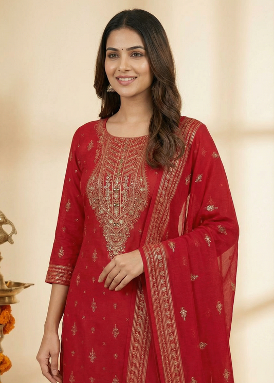 MRP (Inclusive of all taxes)Regular price ₹ 4,249.00₹ 4,249.00 Regular priceUnit price / per₹ 10,699.00Sale priceM L XL 2XL add to cartSale{"id":7741777018966,"title":"Ethnic Printed Straight Kurta with Sharara and Dupatta - Red","handle":"stb33144i5fs","description":"\u003ch1\u003eHighlights\u003c\/h1\u003e\n\u003cp\u003e\u003cbr\u003e\u003cbr\u003e-A vibrant red straight kurta crafted in breathable cotton, adorned with graceful ethnic prints and delicate embroidery for a timeless appeal. Paired with a beautifully printed sharara and a matching dupatta, this ensemble blends traditional charm with effortless elegance—perfect for festive days and cultural celebrations.\u003c\/p\u003e\n\u003ch1\u003e\n\u003cbr\u003eFabric \u0026amp; Colour\u003c\/h1\u003e\n\u003cp\u003e\u003cbr\u003eTop Colour: Red\u003cbr\u003eTop Fabric: Cotton\u003cbr\u003eBottom Colour: Red\u003cbr\u003eBottom Fabric: Viscose Rayon\u003cbr\u003eDupatta Colour: Red\u003cbr\u003eDupatta Fabric: Cotton Blend\u003c\/p\u003e\n\u003ch1\u003eSpecifications\u003c\/h1\u003e\n\u003cp\u003e\u003cbr\u003eTop Design: Floral print, Ethnic print\u003cbr\u003eTop Craft: Embroidery, Plain and Prints\u003cbr\u003eTop Shape: Straight\u003cbr\u003eNeck: Round Neck\u003cbr\u003eSleeve Length: Three-Quarter Sleeves\u003cbr\u003eTop Length: Knee Length\u003cbr\u003eHemline: Straight\u003cbr\u003eSlit: Side Slits\u003c\/p\u003e\n\u003cp\u003eBottom Type: Sharara\u003cbr\u003eBottom Closure: Slip-On\u003cbr\u003eWaistband: Partially Elasticated\u003c\/p\u003e\n\u003cp\u003eDupatta Pattern: Printed\u003cbr\u003eDupatta Border: Printed\u003c\/p\u003e\n\u003cp\u003eWash Care: Machine Wash\u003c\/p\u003e\n\u003cp\u003eLength (in inches)\u003cbr\u003eKurta – 40, Sleeves – 17,\u003cbr\u003eBottom – 42\u003c\/p\u003e\n\u003cp\u003eModel’s Height: 5’7”. Wearing Size S.\u003c\/p\u003e\n\u003ch1\u003eProduct Information\u003c\/h1\u003e\n\u003cp\u003e\u003cbr\u003eManufactured\/Packed\/Marketed By:\u003cbr\u003eFashor Lifestyle Pvt. Ltd.\u003cbr\u003e28\/30, Sudarshanpura Industrial Area,\u003cbr\u003eJaipur - 302006.\u003cbr\u003eCountry of Origin: India\u003c\/p\u003e","published_at":"2025-12-26T08:19:17+05:30","created_at":"2025-12-24T09:38:38+05:30","vendor":"FASHOR","type":"3P Kurta Set","tags":["2XL","above-3000","All Styles","casualwear","colour_red","craft_embroidery","craft_plain-and-prints","design_ethnic-print","design_floral-print","fabric_cotton","KURTI","kurtis","L","meta-size-chart-","shape_straight","XL"],"price":424900,"price_min":424900,"price_max":424900,"available":true,"price_varies":false,"compare_at_price":1069900,"compare_at_price_min":1069900,"compare_at_price_max":1069900,"compare_at_price_varies":false,"variants":[{"id":43763907919958,"title":"M","option1":"M","option2":null,"option3":null,"sku":"38-STB33144I5FS","requires_shipping":true,"taxable":true,"featured_image":{"id":35924920172630,"product_id":7741777018966,"position":3,"created_at":"2025-12-26T07:34:12+05:30","updated_at":"2025-12-26T07:35:15+05:30","alt":null,"width":1536,"height":2752,"src":"\/\/fashor.com\/cdn\/shop\/files\/32954_1.png?v=1766714715","variant_ids":[43763907919958,43763907952726,43763907985494,43763908018262]},"available":false,"name":"Ethnic Printed Straight Kurta with Sharara and Dupatta - Red - M","public_title":"M","options":["M"],"price":424900,"weight":0,"compare_at_price":1069900,"inventory_quantity":0,"inventory_management":"shopify","inventory_policy":"deny","barcode":"","featured_media":{"alt":null,"id":27998999969878,"position":3,"preview_image":{"aspect_ratio":0.558,"height":2752,"width":1536,"src":"\/\/fashor.com\/cdn\/shop\/files\/32954_1.png?v=1766714715"}},"requires_selling_plan":false,"selling_plan_allocations":[],"quantity_rule":{"min":1,"max":null,"increment":1}},{"id":43763907952726,"title":"L","option1":"L","option2":null,"option3":null,"sku":"40-STB33144I5FS","requires_shipping":true,"taxable":true,"featured_image":{"id":35924920172630,"product_id":7741777018966,"position":3,"created_at":"2025-12-26T07:34:12+05:30","updated_at":"2025-12-26T07:35:15+05:30","alt":null,"width":1536,"height":2752,"src":"\/\/fashor.com\/cdn\/shop\/files\/32954_1.png?v=1766714715","variant_ids":[43763907919958,43763907952726,43763907985494,43763908018262]},"available":true,"name":"Ethnic Printed Straight Kurta with Sharara and Dupatta - Red - L","public_title":"L","options":["L"],"price":424900,"weight":0,"compare_at_price":1069900,"inventory_quantity":3,"inventory_management":"shopify","inventory_policy":"deny","barcode":"","featured_media":{"alt":null,"id":27998999969878,"position":3,"preview_image":{"aspect_ratio":0.558,"height":2752,"width":1536,"src":"\/\/fashor.com\/cdn\/shop\/files\/32954_1.png?v=1766714715"}},"requires_selling_plan":false,"selling_plan_allocations":[],"quantity_rule":{"min":1,"max":null,"increment":1}},{"id":43763907985494,"title":"XL","option1":"XL","option2":null,"option3":null,"sku":"42-STB33144I5FS","requires_shipping":true,"taxable":true,"featured_image":{"id":35924920172630,"product_id":7741777018966,"position":3,"created_at":"2025-12-26T07:34:12+05:30","updated_at":"2025-12-26T07:35:15+05:30","alt":null,"width":1536,"height":2752,"src":"\/\/fashor.com\/cdn\/shop\/files\/32954_1.png?v=1766714715","variant_ids":[43763907919958,43763907952726,43763907985494,43763908018262]},"available":true,"name":"Ethnic Printed Straight Kurta with Sharara and Dupatta - Red - XL","public_title":"XL","options":["XL"],"price":424900,"weight":0,"compare_at_price":1069900,"inventory_quantity":4,"inventory_management":"shopify","inventory_policy":"deny","barcode":"","featured_media":{"alt":null,"id":27998999969878,"position":3,"preview_image":{"aspect_ratio":0.558,"height":2752,"width":1536,"src":"\/\/fashor.com\/cdn\/shop\/files\/32954_1.png?v=1766714715"}},"requires_selling_plan":false,"selling_plan_allocations":[],"quantity_rule":{"min":1,"max":null,"increment":1}},{"id":43763908018262,"title":"2XL","option1":"2XL","opti