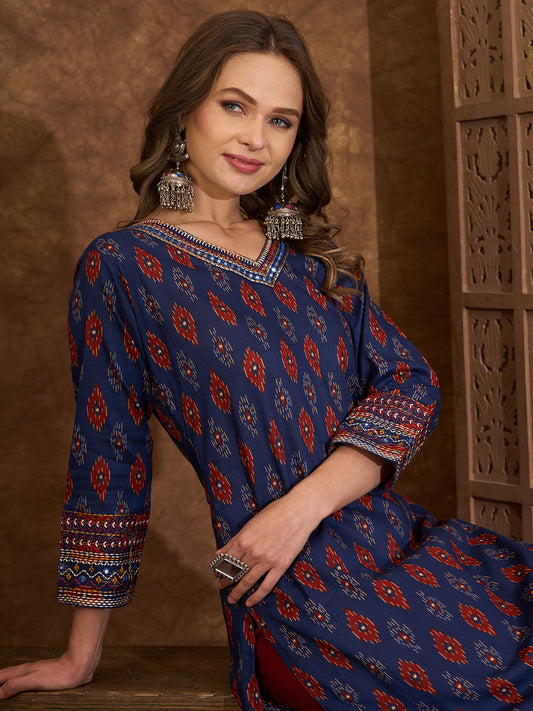 Ethnic Ikat Printed Kantha Embroidered Straight Cut...