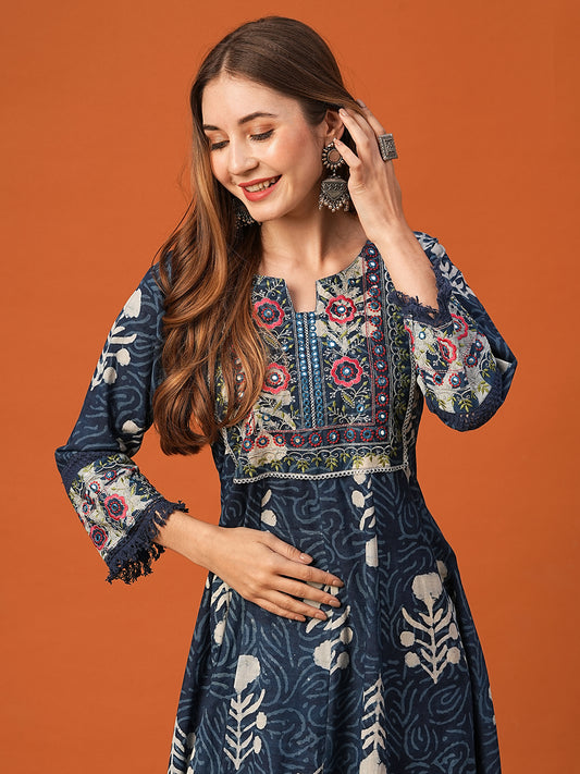 Ethnic Floral Printed & Hand Embroidered Straight...