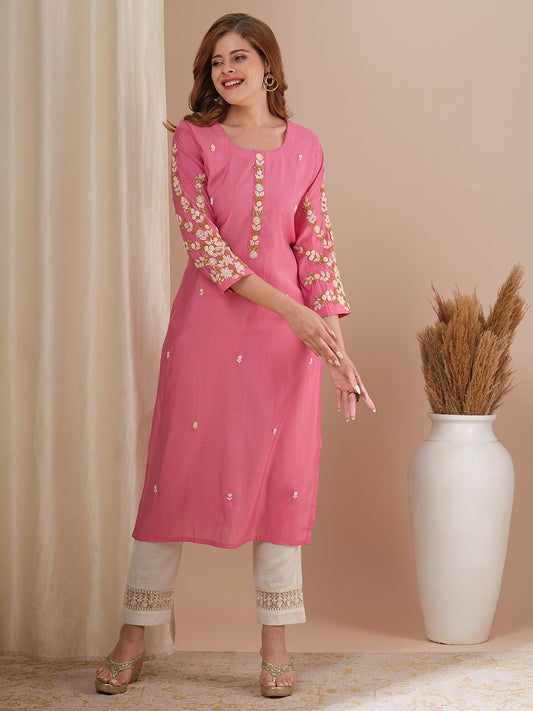 Solid Floral Hand Embroidered Straight Fit Kurta...