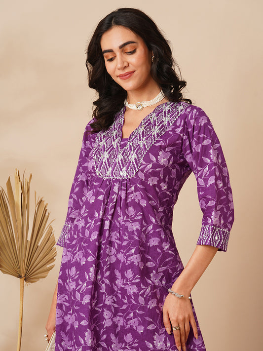 Ethnic Printed & Floral Hand Embroidered A-Line...