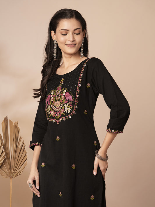 Solid Ethnic Mirror Embroidered Straight Fit Cotton...