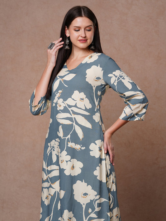 Floral Printed & Embroidered A-Line Paneled Kurta...