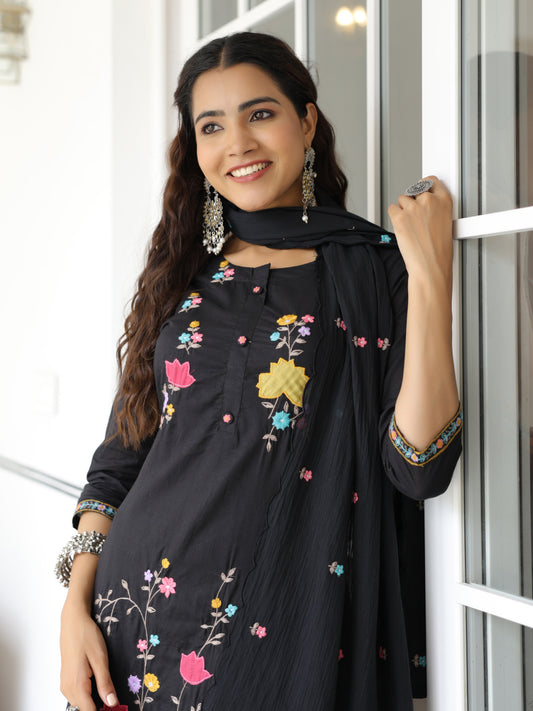 MRP (Inclusive of all taxes)Regular price ₹ 1,999.00₹ 1,999.00 Regular priceUnit price / per₹ 5,399.00Sale priceS M L XL 2XL 3XL add to cartSale{"id":7041761476694,"title":"Solid Floral Embroidered Straight Kurta with Pant \u0026 Pure Cotton Dupatta - Black","handle":"solid-floral-embroidered-straight-kurta-with-pant-pure-cotton-dupatta-black","description":"\u003ch1\u003eHighlights\u003c\/h1\u003e\n-Straight Fit Kurta \u003cbr data-mce-fragment=\"1\"\u003e-Floral Embroidered at Front\u003cbr data-mce-fragment=\"1\"\u003e-Comes with Floral Embroidered Pure Cotton Dupatta\u003cbr data-mce-fragment=\"1\"\u003e\u003cbr data-mce-fragment=\"1\"\u003e\n\u003ch1\u003eFabric \u0026amp; Colour\u003c\/h1\u003e\nTop Colour: Black\u003cbr data-mce-fragment=\"1\"\u003eTop Fabric: Cotton\u003cbr data-mce-fragment=\"1\"\u003eBottom Colour: Black\u003cbr data-mce-fragment=\"1\"\u003eBottom Fabric: Cotton Blend\u003cbr data-mce-fragment=\"1\"\u003eDupatta Colour: Black\u003cbr data-mce-fragment=\"1\"\u003eDupatta Fabric: Pure Cotton\u003cbr data-mce-fragment=\"1\"\u003e\n\u003ch1\u003eSpecifications\u003c\/h1\u003e\nTop Design: Solid\u003cbr data-mce-fragment=\"1\"\u003eTop Craft: Embroidery, Plain and Prints\u003cbr data-mce-fragment=\"1\"\u003eTop Shape: Straight\u003cbr data-mce-fragment=\"1\"\u003eNeck: Round Neck\u003cbr data-mce-fragment=\"1\"\u003eSleeve Length: Three-Quarter Sleeves\u003cbr data-mce-fragment=\"1\"\u003eTop Length: Knee Length\u003cbr data-mce-fragment=\"1\"\u003eHemline: Straight\u003cbr data-mce-fragment=\"1\"\u003eSlit: Side Slits\u003cbr data-mce-fragment=\"1\"\u003e\u003cbr data-mce-fragment=\"1\"\u003eBottom Type: Trousers\u003cbr data-mce-fragment=\"1\"\u003eBottom Closure: Slip-On\u003cbr data-mce-fragment=\"1\"\u003eWaistband: Elasticated\u003cbr data-mce-fragment=\"1\"\u003e\u003cbr data-mce-fragment=\"1\"\u003eDupatta Pattern: Embroidered, Solid\u003cbr data-mce-fragment=\"1\"\u003eDupatta Border: Solid\u003cbr data-mce-fragment=\"1\"\u003e\u003cbr data-mce-fragment=\"1\"\u003eWash Care: Hand Wash\u003cbr data-mce-fragment=\"1\"\u003e\u003cbr data-mce-fragment=\"1\"\u003eMeasurement (in inches)\u003cbr data-mce-fragment=\"1\"\u003eLength – 45, Sleeves – 17,\u003cbr data-mce-fragment=\"1\"\u003eBottom – 38\u003cbr data-mce-fragment=\"1\"\u003e\u003cbr data-mce-fragment=\"1\"\u003eModel’s Height: 5’7”. Wearing Size S.\u003cbr data-mce-fragment=\"1\"\u003e\n\u003ch1\u003eProduct Information\u003c\/h1\u003e\nManufactured\/Packed\/Marketed By:\u003cbr data-mce-fragment=\"1\"\u003eFashor Lifestyle Pvt. Ltd.\u003cbr data-mce-fragment=\"1\"\u003e28\/30, Sudarshanpura Industrial Area,\u003cbr data-mce-fragment=\"1\"\u003eJaipur - 302006.\u003cbr data-mce-fragment=\"1\"\u003eCountry of Origin: India","published_at":"2025-08-04T09:28:32+05:30","created_at":"2024-03-21T15:31:50+05:30","vendor":"Fashor","type":"3P Kurta Set","tags":["1001-2000","2001-3000","20583","2XL","All Styles","bs","casualwear","colour_black","craft_embroidery","craft_plain-and-prints","design_solid","fabric_cotton","ks","KURTI","kurtis","L","meta-size-chart-","monsoo","Sets under 2999","shape_straight"],"price":199900,"price_min":199900,"price_max":199900,"available":true,"price_varies":false,"compare_at_price":539900,"compare_at_price_min":539900,"compare_at_price_max":539900,"compare_at_price_varies":false,"variants":[{"id":41657458589782,"title":"S","option1":"S","option2":null,"option3":null,"sku":"36-ST020583A4FS","requires_shipping":true,"taxable":false,"featured_image":{"id":33087537315926,"product_id":7041761476694,"position":5,"created_at":"2024-08-01T23:10:31+05:30","updated_at":"2025-06-09T20:34:09+05:30","alt":null,"width":3604,"height":4805,"src":"\/\/fashor.com\/cdn\/shop\/files\/26824_5.jpg?v=1749481449","variant_ids":[40825034539094,40825034571862,40825034604630,40825034637398,41657458589782,41657458622550]},"available":false,"name":"Solid Floral Embroidered Straight Kurta with Pant \u0026 Pure Cotton Dupatta - Black - S","public_title":"S","options":["S"],"price":199900,"weight":0,"compare_at_price":539900,"inventory_quantity":0,"inventory_management":"shopify","inventory_policy":"deny","barcode":null,"featured_media":{"alt":null,"id":25818563608662,"position":5,"preview_image":{"aspect_ratio":0.75,"height":4805,"width":3604,"src":"\/\/fashor.com\/cdn\/shop\/files\/26824_5.jpg?v=1749481449"}},"requires_selling_plan":false,"selling_plan_allocations":[],"quantity_rule":{"min":1,"max":null,"increment":1}},{"id":40825034539094,"title":"M","option1":"M","option2":null,"option3":null,"sku":"38-ST020583A4FS","requires_shipping":true,"taxable":false,"featured_image":{"id":33087537315926,"product_id":7041761476694,"position":5,"created_at":"2024-08-01T23:10:31+05:30","updated_at":"2025-06-09T20:34:09+05:30","alt":null,"width":3604,"height":4805,"src":"\/\/fashor.com\/cdn\/shop\/files\/26824_5.jpg?v=1749481449","variant_ids":[40825034539094,40825034571862,40825034604630,40825034637398,41657458589782,41657458622550]},"available":false,"name":"Solid Floral Embroidered Straight Kurta with Pant \u0026 Pure Cotton Dupatta - Black - M","public_title":"M","options":["M"],"price":199900,"weight":0,"compare_at_price":539900,"inventory_quantity":0,"inventory_management":"shopify","inventory_policy":"deny","barcode":null,"featured_media":{"alt":null,"id":25818563608662,"position":5,"preview_image":{"aspect_ratio":0.75,"height":4805,"width":3604,"src":"\/\/fashor.com\/cdn\/shop\/files\/26824_5.jpg?v=1749481449"}},"requires_selling_plan":false,"selling_plan_allocations":[],"quantity_rule":{"min":1,"max":null,"increment":1}},{"id":40825034571862,"title":"L","option1":"L","option2":null,"option3":null,"sku":"40-ST020583A4FS","requires_shipping":true,"taxable":false,"featured_image":{"id":33087537315926,"product_id":7041761476694,"position":5,"created_at":"2024-08-01T23:10:31+05:30","updated_at":"2025-06-09T20:34:09+05:30","alt":null,"width":3604,"height":4805,"src":"\/\/fashor.com\/cdn\/shop\/files\