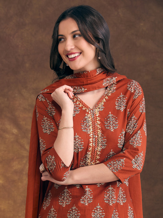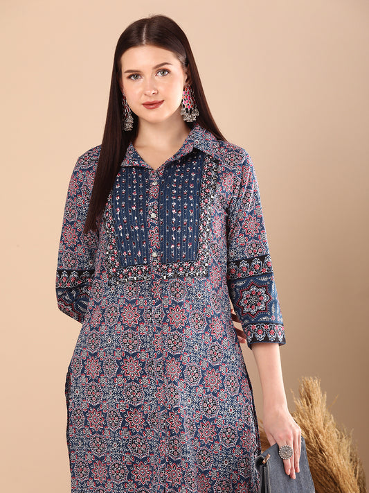 Ethnic Ajrakh Printed & Embroidered Straight Fit...