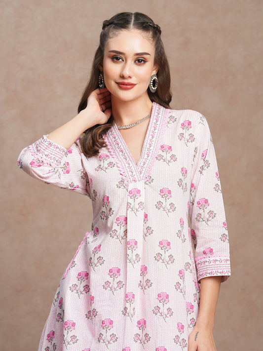 Abstract Floral Printed A-Line Paneled Kurta with...