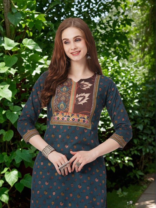 Ethnic Floral Printed Kantha Embroidered Straight Cut...