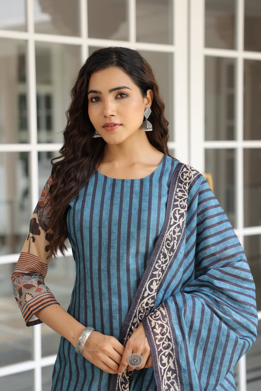 Ethnic Stripes Printed & Hand Embroidered Straight...