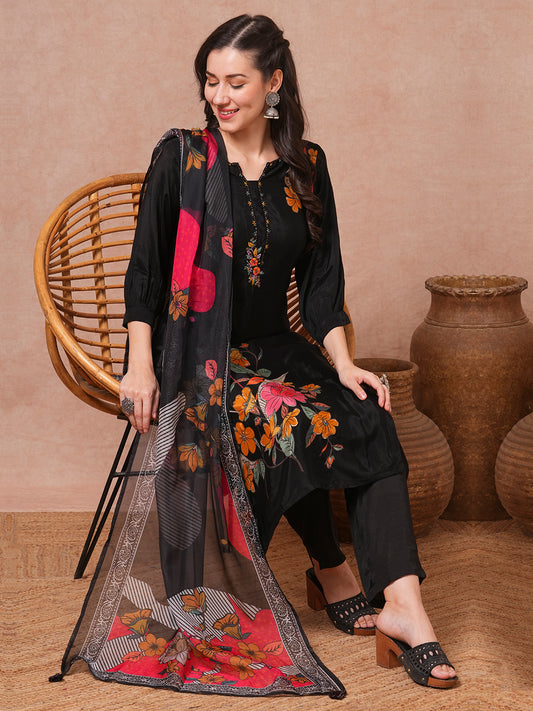 MRP (Inclusive of all taxes)Regular price ₹ 2,599.00₹ 2,599.00 Regular priceUnit price / per₹ 2,749.00Sale priceM L XL 2XL 3XL add to cartSale{"id":7496107851862,"title":"Floral Printed \u0026 Embroidered Straight Fit Kurta with Pant \u0026 Dupatta - Black","handle":"floral-printed-embroidered-straight-fit-kurta-with-pant-dupatta-black-3","description":"\u003ch1\u003eHighlights\u003c\/h1\u003e\n\u003cp\u003e\u003cbr\u003e-Straight Fit Kurta\u003cbr\u003e-Floral Prints all over\u003cbr\u003e-Comes with Floral Printed Dupatta\u003c\/p\u003e\n\u003ch1\u003eFabric \u0026amp; Colour\u003c\/h1\u003e\n\u003cp\u003e\u003cbr\u003eTop Colour: Black\u003cbr\u003eTop Fabric: Muslin Silk\u003cbr\u003eBottom Colour: Black\u003cbr\u003eBottom Fabric: Shantoon\u003cbr\u003eDupatta Colour: Black\u003cbr\u003eDupatta Fabric: Organza\u003c\/p\u003e\n\u003ch1\u003eSpecifications\u003c\/h1\u003e\n\u003cp\u003e\u003cbr\u003eTop Design: Floral print, Solid\u003cbr\u003eTop Craft: Embroidery, Plain and Prints\u003cbr\u003eTop Shape: Straight\u003cbr\u003eNeck: U-Neck\u003cbr\u003eSleeve Length: Three-Quarter Sleeves\u003cbr\u003eTop Length: Knee Length\u003cbr\u003eHemline: Straight\u003cbr\u003eSlit: Side Slits\u003c\/p\u003e\n\u003cp\u003eBottom Type: Trousers\u003cbr\u003eBottom Closure: Drawstring\u003cbr\u003eWaistband: Elasticated\u003c\/p\u003e\n\u003cp\u003eDupatta Pattern: Printed\u003cbr\u003eDupatta Border: Printed\u003c\/p\u003e\n\u003cp\u003eWash Care: Hand Wash\u003c\/p\u003e\n\u003cp\u003eLength (in inches)\u003cbr\u003eKurta – 44, Sleeves – 17,\u003cbr\u003eBottom – 38\u003c\/p\u003e\n\u003cp\u003eModel’s Height: 5’7”. Wearing Size S.\u003c\/p\u003e\n\u003ch1\u003eProduct Information\u003c\/h1\u003e\n\u003cp\u003e\u003cbr\u003eManufactured\/Packed\/Marketed By:\u003cbr\u003eFashor Lifestyle Pvt. Ltd.\u003cbr\u003e28\/30, Sudarshanpura Industrial Area,\u003cbr\u003eJaipur - 302006.\u003cbr\u003eCountry of Origin: India\u003c\/p\u003e","published_at":"2025-10-16T11:43:40+05:30","created_at":"2025-01-20T14:02:51+05:30","vendor":"FASHOR","type":"3P Kurta Set","tags":["2001-3000","27380","All Styles","casualwear","colour_black","craft_embroidery","craft_plain-and-prints","design_floral-print","design_solid","fabric_muslin-silk","festivewear","KURTI","kurtis","M","meta-size-chart-","monsoo","now-trending","shape_straight"],"price":259900,"price_min":259900,"price_max":259900,"available":true,"price_varies":false,"compare_at_price":274900,"compare_at_price_min":274900,"compare_at_price_max":274900,"compare_at_price_varies":false,"variants":[{"id":42061945864278,"title":"M","option1":"M","option2":null,"option3":null,"sku":"38-STB27380L4OS","requires_shipping":true,"taxable":false,"featured_image":{"id":33959235453014,"product_id":7496107851862,"position":3,"created_at":"2025-01-20T14:03:12+05:30","updated_at":"2025-06-09T19:07:58+05:30","alt":null,"width":1080,"height":1440,"src":"\/\/fashor.com\/cdn\/shop\/files\/29381_8.jpg?v=1749476278","variant_ids":[42061945864278,42061945897046,42061945929814,42061945962582,42061945995350]},"available":true,"name":"Floral Printed \u0026 Embroidered Straight Fit Kurta with Pant \u0026 Dupatta - Black - M","public_title":"M","options":["M"],"price":259900,"weight":0,"compare_at_price":274900,"inventory_quantity":1,"inventory_management":"shopify","inventory_policy":"deny","barcode":null,"featured_media":{"alt":null,"id":26437275156566,"position":3,"preview_image":{"aspect_ratio":0.75,"height":1440,"width":1080,"src":"\/\/fashor.com\/cdn\/shop\/files\/29381_8.jpg?v=1749476278"}},"requires_selling_plan":false,"selling_plan_allocations":[],"quantity_rule":{"min":1,"max":null,"increment":1}},{"id":42061945897046,"title":"L","option1":"L","option2":null,"option3":null,"sku":"40-STB27380L4OS","requires_shipping":true,"taxable":false,"featured_image":{"id":33959235453014,"product_id":7496107851862,"position":3,"created_at":"2025-01-20T14:03:12+05:30","updated_at":"2025-06-09T19:07:58+05:30","alt":null,"width":1080,"height":1440,"src":"\/\/fashor.com\/cdn\/shop\/files\/29381_8.jpg?v=1749476278","variant_ids":[42061945864278,42061945897046,42061945929814,42061945962582,42061945995350]},"available":false,"name":"Floral Printed \u0026 Embroidered Straight Fit Kurta with Pant \u0026 Dupatta - Black - L","public_title":"L","options":["L"],"price":259900,"weight":0,"compare_at_price":274900,"inventory_quantity":0,"inventory_management":"shopify","inventory_policy":"deny","barcode":null,"featured_media":{"alt":null,"id":26437275156566,"position":3,"preview_image":{"aspect_ratio":0.75,"height":1440,"width":1080,"src":"\/\/fashor.com\/cdn\/shop\/files\/29381_8.jpg?v=1749476278"}},"requires_selling_plan":false,"selling_plan_allocations":[],"quantity_rule":{"min":1,"max":null,"increment":1}},{"id":42061945929814,"title":"XL","option1":"XL","option2":null,"option3":null,"sku":"42-STB27380L4OS","requires_shipping":true,"taxable":false,"featured_image":{"id":33959235453014,"product_id":7496107851862,"position":3,"created_at":"2025-01-20T14:03:12+05:30","updated_at":"2025-06-09T19:07:58+05:30","alt":null,"width":1080,"height":1440,"src":"\/\/fashor.com\/cdn\/shop\/files\/29381_8.jpg?v=1749476278","variant_ids":[42061945864278,42061945897046,42061945929814,42061945962582,42061945995350]},"available":false,"name":"Floral Printed \u0026 Embroidered Straight Fit Kurta with Pant \u0026 Dupatta - Black - XL","public_title":"XL","options":["XL"],"price":259900,"weight":0,"compare_at_price":274900,"inventory_quantity":0,"inventory_management":"shopify","inventory_policy":"deny","barcode":null,"featured_media":{"alt":null,"id":26437275156566,"position":3,"preview_image":{"aspect_ratio":0.75,"height":1440,"width":1080,"src":"\/\/fashor.com\/cdn\/shop\/files\/29381_8.jpg?v=1749476278"}},"requires_selling_plan":false,"selling_plan_allocations":[],"quantity_rule":{"min":1,"max":null,"increment":1}},{"id":42061945962582,"title":"2XL","option1":"2XL","option2":null,"option3":null,"sku