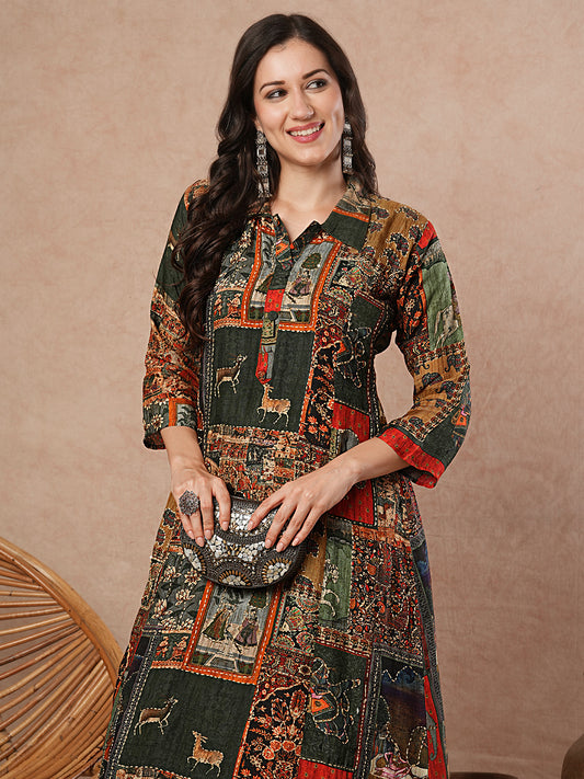 Ethnic Pichwai Printed & Kantha Embroidered Kurta...