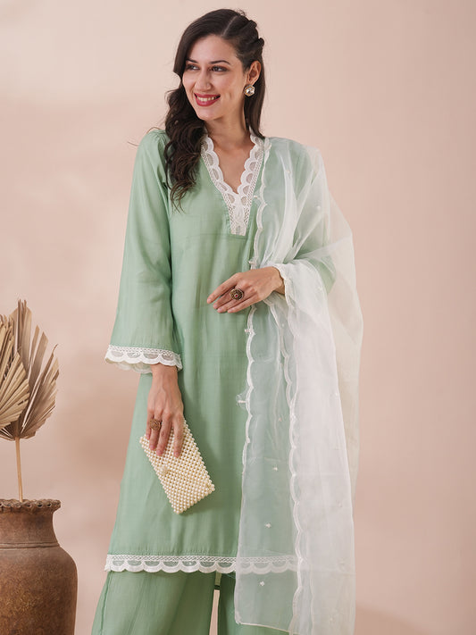 Solid Scalloped Straight Fit Kurta with Palazzo...