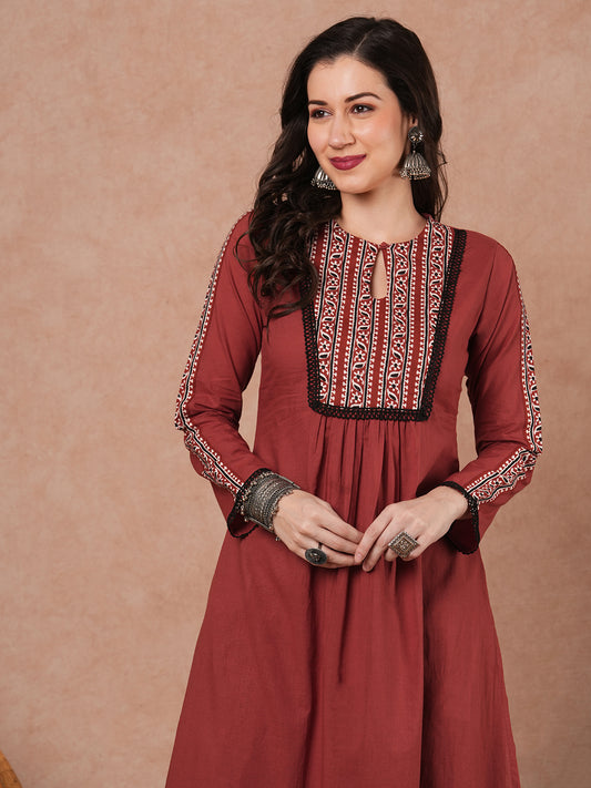 Solid Ethnic Printed A-Line Pleated Kurta with...