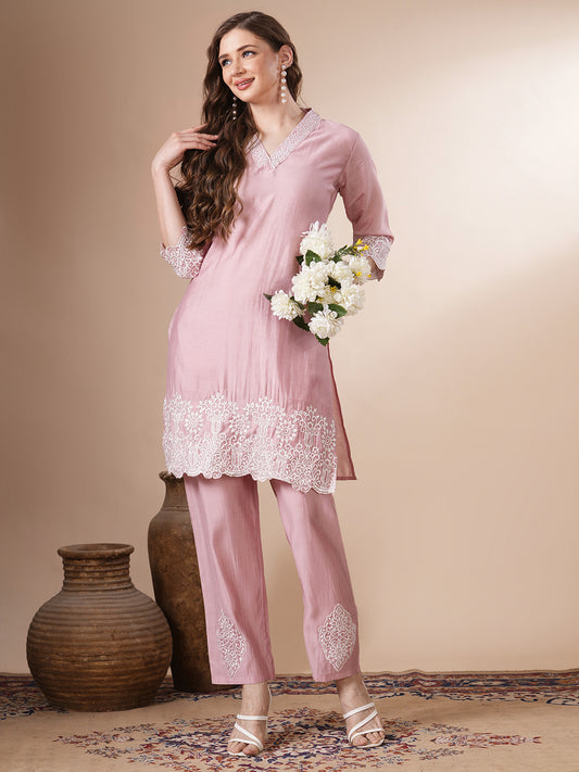 Solid Floral Embroidered Straight Fit Co-ord Set...