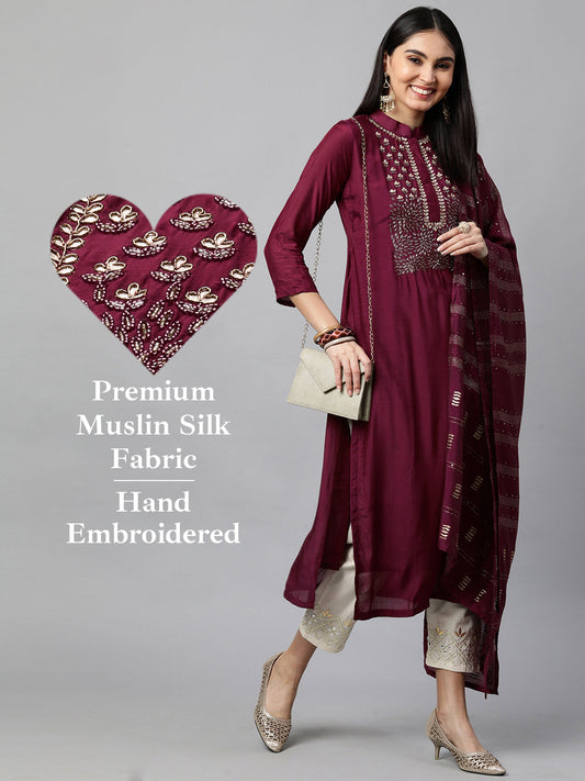 MRP (Inclusive of all taxes)Regular price ₹ 1,799.00₹ 1,799.00 Regular priceUnit price / per₹ 3,999.00Sale priceS M L XL 2XL 3XL 4XL 5XL add to cartSale{"id":6874550501462,"title":"Festive Embroidered Kurta with Woven Zari Dupatta - Burgundy","handle":"copy-of-festive-embroidered-kurta-with-woven-zari-dupatta-burgundy","description":"\u003cp data-mce-fragment=\"1\"\u003e\u003cspan data-mce-fragment=\"1\" style=\"font-weight: 400;\" data-mce-style=\"font-weight: 400;\"\u003eStyle: Straight\u003c\/span\u003e\u003c\/p\u003e\n\u003cp data-mce-fragment=\"1\"\u003e\u003cspan data-mce-fragment=\"1\" style=\"font-weight: 400;\" data-mce-style=\"font-weight: 400;\"\u003eNeckline: Mandarin Collar\u003c\/span\u003e\u003c\/p\u003e\n\u003cp data-mce-fragment=\"1\"\u003e\u003cspan data-mce-fragment=\"1\" style=\"font-weight: 400;\" data-mce-style=\"font-weight: 400;\"\u003eSleeve Pattern: Regular\u003c\/span\u003e\u003c\/p\u003e\n\u003cp data-mce-fragment=\"1\"\u003e\u003cspan data-mce-fragment=\"1\" style=\"font-weight: 400;\" data-mce-style=\"font-weight: 400;\"\u003eSleeve Length: 3\/4th\u003c\/span\u003e\u003c\/p\u003e\n\u003cp data-mce-fragment=\"1\"\u003e\u003cspan data-mce-fragment=\"1\" style=\"font-weight: 400;\" data-mce-style=\"font-weight: 400;\"\u003eProduct Details:\u003c\/span\u003e\u003c\/p\u003e\n\u003cul data-mce-fragment=\"1\"\u003e\n\u003cli data-mce-fragment=\"1\"\u003e\u003cspan data-mce-fragment=\"1\" style=\"font-weight: 400;\" data-mce-style=\"font-weight: 400;\"\u003e Straight Fit Kurta\u003c\/span\u003e\u003c\/li\u003e\n\u003cli data-mce-fragment=\"1\"\u003e\u003cspan data-mce-fragment=\"1\" style=\"font-weight: 400;\" data-mce-style=\"font-weight: 400;\"\u003e Cutdana Hand Embroidered Yoke\u003c\/span\u003e\u003c\/li\u003e\n\u003cli data-mce-fragment=\"1\"\u003e\u003cspan data-mce-fragment=\"1\" style=\"font-weight: 400;\" data-mce-style=\"font-weight: 400;\"\u003e Enhanced With Gota Patti \u003c\/span\u003e\u003c\/li\u003e\n\u003cli data-mce-fragment=\"1\"\u003e\u003cspan data-mce-fragment=\"1\" style=\"font-weight: 400;\" data-mce-style=\"font-weight: 400;\"\u003e Has a Lining\u003c\/span\u003e\u003c\/li\u003e\n\u003cli data-mce-fragment=\"1\"\u003e\u003cspan data-mce-fragment=\"1\" style=\"font-weight: 400;\" data-mce-style=\"font-weight: 400;\"\u003e Comes with Woven Zari Dupatta\u003c\/span\u003e\u003c\/li\u003e\n\u003cli data-mce-fragment=\"1\"\u003e\u003cspan data-mce-fragment=\"1\" style=\"font-weight: 400;\" data-mce-style=\"font-weight: 400;\"\u003e Enhanced With Woven Sequin work\u003c\/span\u003e\u003c\/li\u003e\n\u003c\/ul\u003e\n\u003cp data-mce-fragment=\"1\"\u003e\u003cspan data-mce-fragment=\"1\" style=\"font-weight: 400;\" data-mce-style=\"font-weight: 400;\"\u003eModel’s Height: 5’7” ft Size: Wearing Size S.\u003c\/span\u003e\u003c\/p\u003e\n\u003ch1 data-mce-fragment=\"1\"\u003e\u003cspan data-mce-fragment=\"1\" style=\"font-weight: 400;\" data-mce-style=\"font-weight: 400;\"\u003eFabric Details\u003c\/span\u003e\u003c\/h1\u003e\n\u003cp data-mce-fragment=\"1\"\u003e\u003cspan data-mce-fragment=\"1\" style=\"font-weight: 400;\" data-mce-style=\"font-weight: 400;\"\u003eFabric: Kurta - Muslin Silk, Dupatta - Muslin Silk\u003c\/span\u003e\u003c\/p\u003e\n\u003cp data-mce-fragment=\"1\"\u003e\u003cspan data-mce-fragment=\"1\" style=\"font-weight: 400;\" data-mce-style=\"font-weight: 400;\"\u003eColor: Kurta - Burgundy, Dupatta - Burgundy\u003c\/span\u003e\u003c\/p\u003e\n\u003cp data-mce-fragment=\"1\"\u003e\u003cspan data-mce-fragment=\"1\" style=\"font-weight: 400;\" data-mce-style=\"font-weight: 400;\"\u003eWash Care: Dry Clean\u003c\/span\u003e\u003c\/p\u003e\n\u003ch1\u003eGarment Measurements\u003c\/h1\u003e\n\u003cp\u003e\u003cstrong\u003eMeasurement (in inches) \u003c\/strong\u003e\u003c\/p\u003e\n\u003cp\u003eLength – 47, Sleeves – 17\u003c\/p\u003e\n\u003ch1 data-mce-fragment=\"1\"\u003e\u003cspan data-mce-fragment=\"1\"\u003eProduct Information\u003c\/span\u003e\u003c\/h1\u003e\n\u003cp data-mce-fragment=\"1\"\u003e\u003cspan data-mce-fragment=\"1\"\u003e\u003cstrong\u003eManufactured\/Packed\/Marketed By:\u003c\/strong\u003e\u003cbr\u003e\u003c\/span\u003e\u003cspan data-mce-fragment=\"1\"\u003eFashor Lifestyle Pvt. Ltd.\u003cbr\u003e28\/30, Sudershanpura Industrial Area,\u003cbr\u003eJaipur - 302006.\u003cbr\u003e\u003cstrong\u003eCountry of Origin:\u003c\/strong\u003e India\u003c\/span\u003e\u003c\/p\u003e","published_at":"2025-12-04T11:30:24+05:30","created_at":"2023-08-22T14:09:52+05:30","vendor":"Fashor","type":"2P Kurta Set","tags":["06568","1001-2000","2000 - 3000","2001-3000","2XL","All Styles","bogo-zone","colour_burgundy","KURTI","kurtis","meta-size-chart-","monsoo","muslin-silk","occ-Festive","ornm-GottaPatti","plusbogo","pp-EthnicMotifs","Products with discounts","shape-Straight","straight"],"price":179900,"price_min":179900,"price_max":179900,"available":true,"price_varies":false,"compare_at_price":399900,"compare_at_price_min":399900,"compare_at_price_max":399900,"compare_at_price_varies":false,"variants":[{"id":40271524823126,"title":"S","option1":"S","option2":null,"option3":null,"sku":"36-KDB06568J1F2","requires_shipping":true,"taxable":false,"featured_image":{"id":31564024741974,"product_id":6874550501462,"position":1,"created_at":"2023-08-22T14:10:05+05:30","updated_at":"2023-08-29T08:32:34+05:30","alt":null,"width":1080,"height":1440,"src":"\/\/fashor.com\/cdn\/shop\/files\/13021_10_c82de48d-6705-4427-a357-60767dec0201.jpg?v=1693278154","variant_ids":[40271524823126,40271524855894,40271524888662,40271524921430,40271524954198,40271524986966,40271525019734,40271525052502]},"available":false,"name":"Festive Embroidered Kurta with Woven Zari Dupatta - Burgundy - S","public_title":"S","options":["S"],"price":179900,"weight":0,"compare_at_price":399900,"inventory_quantity":0,"inventory_management":"shopify","inventory_policy":"deny","barcode":null,"featured_media":{"alt":null,"id":24276451950678,"position":1,"previe