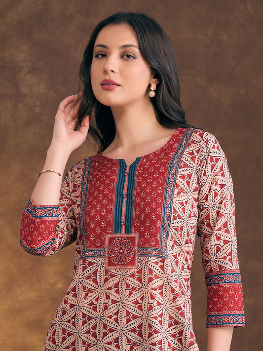 Ethnic Floral Printed & Embroidered Straight Fit...