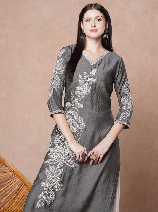 Solid Lurex Floral Embroidered Straight Kurta with...
