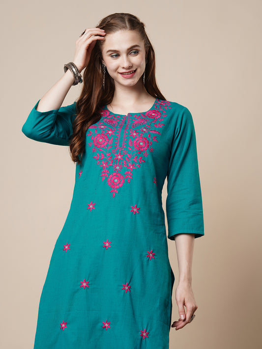 Ethnic Floral Printed Embroidered Straight Fit Kurta...
