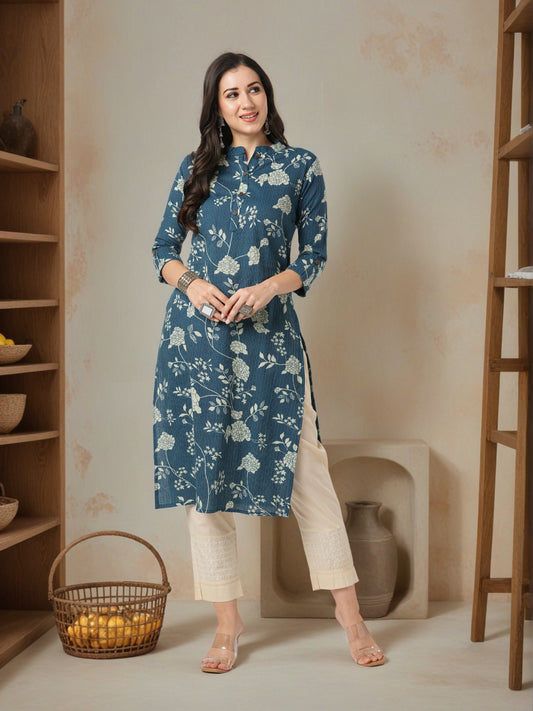 MRP (Inclusive of all taxes)Regular price ₹ 679.00₹ 679.00 Regular priceUnit price / per₹ 1,899.00Sale priceM L XL 2XL 3XL add to cartSale{"id":7560941469782,"title":"Floral Printed \u0026 Kantha Woven Straight Fit Kurta - Blue","handle":"floral-printed-kantha-woven-straight-fit-kurta-blue","description":"\u003ch1\u003eHighlights\u003cbr\u003e\n\u003c\/h1\u003e\n\u003cp\u003e\u003cbr\u003e-Make a graceful statement in this blue straight-fit kurta, crafted from soft cotton with traditional Kantha weave detailing. Featuring delicate floral prints, a mandarin collar, and a front placket accented with rustic wooden buttons, it blends artisanal charm with everyday elegance.\u003c\/p\u003e\n\u003ch1\u003eFabric \u0026amp; Colour\u003c\/h1\u003e\n\u003cp\u003e\u003cbr\u003eColour: Blue\u003cbr\u003eFabric: Cotton\u003c\/p\u003e\n\u003ch1\u003eSpecifications\u003c\/h1\u003e\n\u003cp\u003e\u003cbr\u003eDesign: Floral print, Ethnic print, Solid\u003cbr\u003eCraft: Plain and Prints\u003cbr\u003eShape: Straight\u003cbr\u003eNeck: Mandarin Collar\u003cbr\u003eSleeve Length: Three-Quarter Sleeves\u003cbr\u003eTop Length: Calf Length\u003cbr\u003eHemline: Straight\u003cbr\u003eSlit: Side Slits\u003c\/p\u003e\n\u003cp\u003eWash Care: Machine Wash\u003c\/p\u003e\n\u003cp\u003eLength (in inches)\u003cbr\u003eKurta – 45, Sleeves – 17\u003c\/p\u003e\n\u003cp\u003eModel’s Height: 5’7”. Wearing Size S.\u003c\/p\u003e\n\u003ch1\u003eProduct Information\u003c\/h1\u003e\n\u003cp\u003e\u003cbr\u003eManufactured\/Packed\/Marketed By:\u003cbr\u003eFashor Lifestyle Pvt. Ltd.\u003cbr\u003e28\/30, Sudarshanpura Industrial Area,\u003cbr\u003eJaipur - 302006.\u003cbr\u003eCountry of Origin: India\u003c\/p\u003e","published_at":"2025-08-27T10:43:34+05:30","created_at":"2025-05-26T13:55:51+05:30","vendor":"FASHOR","type":"Kurtas","tags":["29730","All Styles","casualwear","colour_blue","craft_plain-and-prints","design_ethnic-print","design_floral-print","design_solid","discount-zone","fabric_cotton","KURTI","kurtis","M","meta-size-chart-","monsoo","now-trending","offer-zone","shape_straight","single-kurta","under-1000","workwear"],"price":67900,"price_min":67900,"price_max":67900,"available":true,"price_varies":false,"compare_at_price":189900,"compare_at_price_min":189900,"compare_at_price_max":189900,"compare_at_price_varies":false,"variants":[{"id":42335771754582,"title":"M","option1":"M","option2":null,"option3":null,"sku":"38-KAC29730B5FS","requires_shipping":true,"taxable":false,"featured_image":{"id":34441648734294,"product_id":7560941469782,"position":5,"created_at":"2025-05-26T13:56:20+05:30","updated_at":"2025-05-26T13:57:21+05:30","alt":null,"width":1080,"height":1440,"src":"\/\/fashor.com\/cdn\/shop\/files\/30953_8.jpg?v=1748248041","variant_ids":[42335771754582,42335771787350,42335771820118,42335771852886,42335771885654]},"available":true,"name":"Floral Printed \u0026 Kantha Woven Straight Fit Kurta - Blue - M","public_title":"M","options":["M"],"price":67900,"weight":0,"compare_at_price":189900,"inventory_quantity":1,"inventory_management":"shopify","inventory_policy":"deny","barcode":"","featured_media":{"alt":null,"id":26788928651350,"position":5,"preview_image":{"aspect_ratio":0.75,"height":1440,"width":1080,"src":"\/\/fashor.com\/cdn\/shop\/files\/30953_8.jpg?v=1748248041"}},"requires_selling_plan":false,"selling_plan_allocations":[],"quantity_rule":{"min":1,"max":null,"increment":1}},{"id":42335771787350,"title":"L","option1":"L","option2":null,"option3":null,"sku":"40-KAC29730B5FS","requires_shipping":true,"taxable":false,"featured_image":{"id":34441648734294,"product_id":7560941469782,"position":5,"created_at":"2025-05-26T13:56:20+05:30","updated_at":"2025-05-26T13:57:21+05:30","alt":null,"width":1080,"height":1440,"src":"\/\/fashor.com\/cdn\/shop\/files\/30953_8.jpg?v=1748248041","variant_ids":[42335771754582,42335771787350,42335771820118,42335771852886,42335771885654]},"available":false,"name":"Floral Printed \u0026 Kantha Woven Straight Fit Kurta - Blue - L","public_title":"L","options":["L"],"price":67900,"weight":0,"compare_at_price":189900,"inventory_quantity":0,"inventory_management":"shopify","inventory_policy":"deny","barcode":"","featured_media":{"alt":null,"id":26788928651350,"position":5,"preview_image":{"aspect_ratio":0.75,"height":1440,"width":1080,"src":"\/\/fashor.com\/cdn\/shop\/files\/30953_8.jpg?v=1748248041"}},"requires_selling_plan":false,"selling_plan_allocations":[],"quantity_rule":{"min":1,"max":null,"increment":1}},{"id":42335771820118,"title":"XL","option1":"XL","option2":null,"option3":null,"sku":"42-KAC29730B5FS","requires_shipping":true,"taxable":false,"featured_image":{"id":34441648734294,"product_id":7560941469782,"position":5,"created_at":"2025-05-26T13:56:20+05:30","updated_at":"2025-05-26T13:57:21+05:30","alt":null,"width":1080,"height":1440,"src":"\/\/fashor.com\/cdn\/shop\/files\/30953_8.jpg?v=1748248041","variant_ids":[42335771754582,42335771787350,42335771820118,42335771852886,42335771885654]},"available":false,"name":"Floral Printed \u0026 Kantha Woven Straight Fit Kurta - Blue - XL","public_title":"XL","options":["XL"],"price":67900,"weight":0,"compare_at_price":189900,"inventory_quantity":0,"inventory_management":"shopify","inventory_policy":"deny","barcode":"","featured_media":{"alt":null,"id":26788928651350,"position":5,"preview_image":{"aspect_ratio":0.75,"height":1440,"width":1080,"src":"\/\/fashor.com\/cdn\/shop\/files\/30953_8.jpg?v=1748248041"}},"requires_selling_plan":false,"selling_plan_allocations":[],"quantity_rule":{"min":1,"max":null,"increment":1}},{"id":42335771852886,"title":"2XL","option1":"2XL","option2":null,"option3":null,"sku":"44-KAC29730B5FS","requires_shipping":true,"taxable":false,"featured_image":{"id":34441648734294,"product_id":7560941469782,"position":5,"created_at":"2025-05-26T13:56:20+05:30","updated_at":"2025-05-26T13:57:21+05:30","alt":null,"width":1080,"height":1440,"src":"\/\/fashor.com\/cdn\/shop\/files\/30953_8