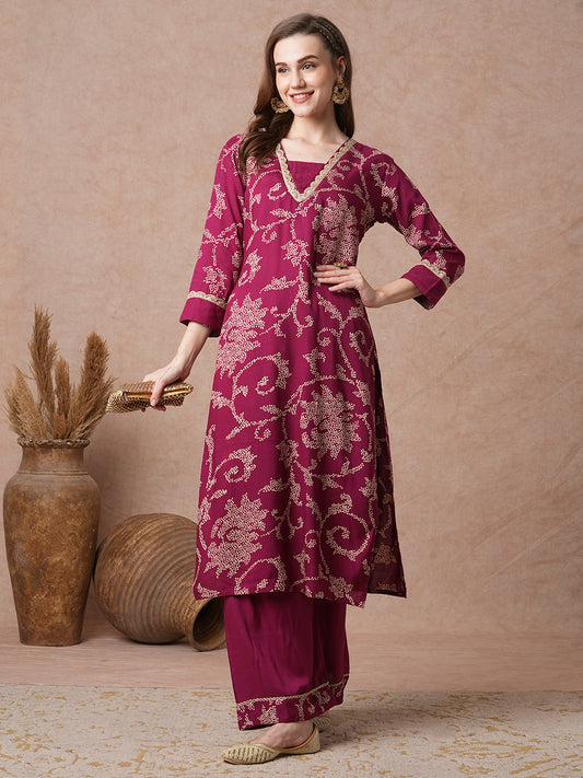 Ethnic Floral Foil Printed & Embroidered Straight...