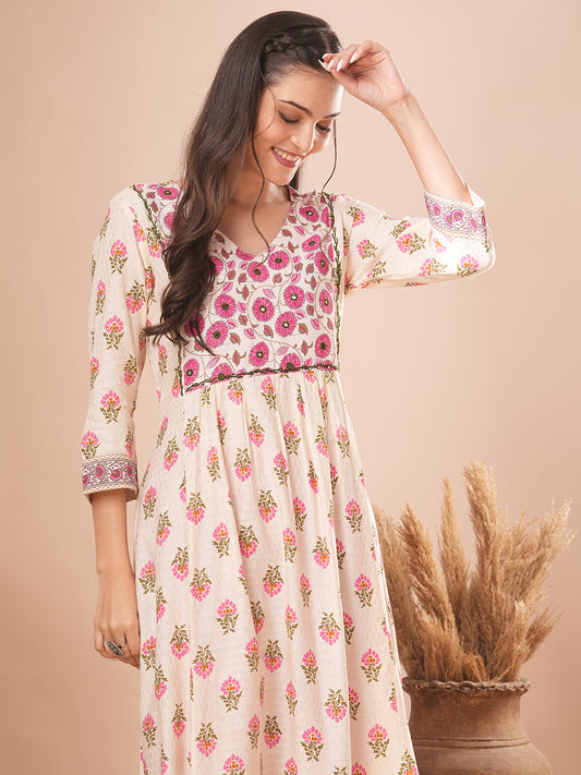 Ethnic Floral Printed & Mirror Embroidered A-line...