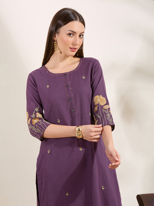Solid Floral Thread Embroidered Straight Fit Co-ord...