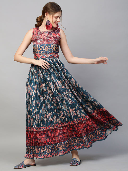 Ethnic Printed & Sequin Embroidered Maxi Flared...