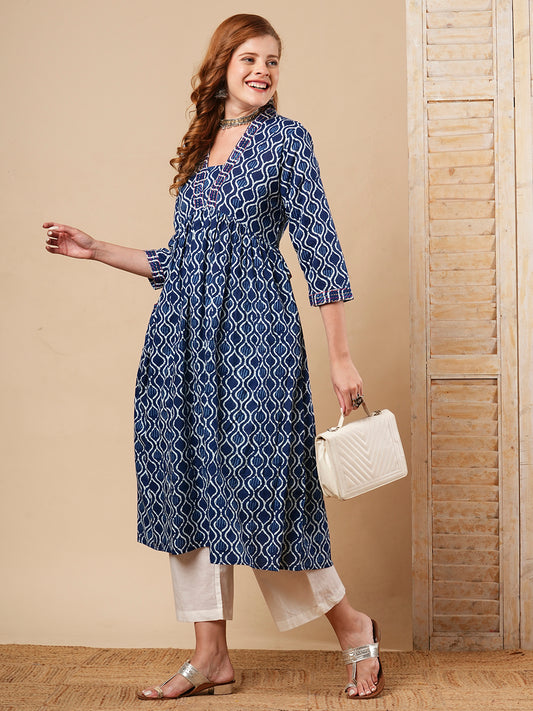 Ethnic Printed & Embroidered A-Line Pleated Short...