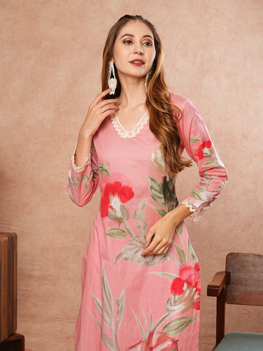 MRP (Inclusive of all taxes)Regular price ₹ 1,199.00₹ 1,199.00 Regular priceUnit price / per₹ 3,599.00Sale priceS M L XL 2XL 3XL 4XL 5XL 6XL add to cartSale{"id":6783443894358,"title":"Floral Printed \u0026 Embroidered A-Line Kurta with Pants - Light Pink","handle":"floral-printed-embroidered-a-line-kurta-with-pants-light-pink","description":"\u003cp data-mce-fragment=\"1\"\u003e\u003cspan style=\"font-weight: 400;\" data-mce-fragment=\"1\" data-mce-style=\"font-weight: 400;\"\u003e\u003c\/span\u003e\u003cspan style=\"font-weight: 400;\" data-mce-fragment=\"1\" data-mce-style=\"font-weight: 400;\"\u003eStyle: Kurta - A-Line, Bottom - Pants\u003c\/span\u003e\u003c\/p\u003e\n\u003cp data-mce-fragment=\"1\"\u003e\u003cspan style=\"font-weight: 400;\" data-mce-fragment=\"1\" data-mce-style=\"font-weight: 400;\"\u003eType: Everyday Wear\u003c\/span\u003e\u003c\/p\u003e\n\u003cp data-mce-fragment=\"1\"\u003e\u003cspan style=\"font-weight: 400;\" data-mce-fragment=\"1\" data-mce-style=\"font-weight: 400;\"\u003eNeckline: Round Neckline\u003c\/span\u003e\u003c\/p\u003e\n\u003cp data-mce-fragment=\"1\"\u003e\u003cspan style=\"font-weight: 400;\" data-mce-fragment=\"1\" data-mce-style=\"font-weight: 400;\"\u003eSleeve Pattern: Regular Sleeves\u003c\/span\u003e\u003c\/p\u003e\n\u003cp data-mce-fragment=\"1\"\u003e\u003cspan style=\"font-weight: 400;\" data-mce-fragment=\"1\" data-mce-style=\"font-weight: 400;\"\u003eSleeve Length: 3\/4th\u003c\/span\u003e\u003c\/p\u003e\n\u003cp data-mce-fragment=\"1\"\u003e\u003cspan style=\"font-weight: 400;\" data-mce-fragment=\"1\" data-mce-style=\"font-weight: 400;\"\u003eProduct Details:\u003c\/span\u003e\u003c\/p\u003e\n\u003cul data-mce-fragment=\"1\"\u003e\n\u003cli data-mce-fragment=\"1\"\u003e\u003cspan style=\"font-weight: 400;\" data-mce-fragment=\"1\" data-mce-style=\"font-weight: 400;\"\u003e A-Line Flare Kurta\u003c\/span\u003e\u003c\/li\u003e\n\u003cli data-mce-fragment=\"1\"\u003e\u003cspan style=\"font-weight: 400;\" data-mce-fragment=\"1\" data-mce-style=\"font-weight: 400;\"\u003e Floral Prints all over\u003c\/span\u003e\u003c\/li\u003e\n\u003cli data-mce-fragment=\"1\"\u003e\u003cspan style=\"font-weight: 400;\" data-mce-fragment=\"1\" data-mce-style=\"font-weight: 400;\"\u003e Hand Embroidered Yoke\u003c\/span\u003e\u003c\/li\u003e\n\u003cli data-mce-fragment=\"1\"\u003e\u003cspan style=\"font-weight: 400;\" data-mce-fragment=\"1\" data-mce-style=\"font-weight: 400;\"\u003e Embellished with Foil Mirror \u0026amp; Zari Detailing \u003c\/span\u003e\u003c\/li\u003e\n\u003cli data-mce-fragment=\"1\"\u003e\u003cspan style=\"font-weight: 400;\" data-mce-fragment=\"1\" data-mce-style=\"font-weight: 400;\"\u003e Floral Hand Work Detailing at Yoke\u003c\/span\u003e\u003c\/li\u003e\n\u003cli data-mce-fragment=\"1\"\u003e\u003cspan style=\"font-weight: 400;\" data-mce-fragment=\"1\" data-mce-style=\"font-weight: 400;\"\u003e Enhanced with Temple Gota Detailing\u003c\/span\u003e\u003c\/li\u003e\n\u003cli data-mce-fragment=\"1\"\u003e\u003cspan style=\"font-weight: 400;\" data-mce-fragment=\"1\" data-mce-style=\"font-weight: 400;\"\u003e Tie-Ups with Tassels at Back Neckline\u003c\/span\u003e\u003c\/li\u003e\n\u003cli data-mce-fragment=\"1\"\u003e\u003cspan style=\"font-weight: 400;\" data-mce-fragment=\"1\" data-mce-style=\"font-weight: 400;\"\u003e Paired with Solid Pants\u003c\/span\u003e\u003c\/li\u003e\n\u003cli data-mce-fragment=\"1\"\u003e\u003cspan style=\"font-weight: 400;\" data-mce-fragment=\"1\" data-mce-style=\"font-weight: 400;\"\u003e Provided with Cross Pockets\u003c\/span\u003e\u003c\/li\u003e\n\u003cli data-mce-fragment=\"1\"\u003e\u003cspan style=\"font-weight: 400;\" data-mce-fragment=\"1\" data-mce-style=\"font-weight: 400;\"\u003e Partially Elasticated Waistline\u003c\/span\u003e\u003c\/li\u003e\n\u003cli data-mce-fragment=\"1\"\u003e\u003cspan style=\"font-weight: 400;\" data-mce-fragment=\"1\" data-mce-style=\"font-weight: 400;\"\u003e Drawstring Closure\u003c\/span\u003e\u003c\/li\u003e\n\u003c\/ul\u003e\n\u003cp data-mce-fragment=\"1\"\u003e\u003cspan style=\"font-weight: 400;\" data-mce-fragment=\"1\" data-mce-style=\"font-weight: 400;\"\u003eModel’s Height: 5’7” ft. Size: Wearing Size S \u003c\/span\u003e\u003c\/p\u003e\n\u003ch1 data-mce-fragment=\"1\"\u003e\u003cspan style=\"font-weight: 400;\" data-mce-fragment=\"1\" data-mce-style=\"font-weight: 400;\"\u003eFabric Details\u003c\/span\u003e\u003c\/h1\u003e\n\u003cp data-mce-fragment=\"1\"\u003e\u003cspan style=\"font-weight: 400;\" data-mce-fragment=\"1\" data-mce-style=\"font-weight: 400;\"\u003eFabric: Kurta - Cotton, Bottom - Cotton\u003c\/span\u003e\u003c\/p\u003e\n\u003cp data-mce-fragment=\"1\"\u003e\u003cspan style=\"font-weight: 400;\" data-mce-fragment=\"1\" data-mce-style=\"font-weight: 400;\"\u003eColour: Kurta - Light Pink, Bottom - Purple\u003c\/span\u003e\u003c\/p\u003e\n\u003cp data-mce-fragment=\"1\"\u003e\u003cspan style=\"font-weight: 400;\" data-mce-fragment=\"1\" data-mce-style=\"font-weight: 400;\"\u003eWash Care: Hand wash in cold water\u003c\/span\u003e\u003c\/p\u003e\n\u003ch1\u003eGarment Measurements\u003c\/h1\u003e\n\u003cp\u003e\u003cstrong\u003eMeasurement (in inches) \u003c\/strong\u003e\u003c\/p\u003e\n\u003cp\u003eLength – 47, Sleeves – 17,\u003c\/p\u003e\n\u003cp\u003eBottom - 39\u003c\/p\u003e\n\u003ch1 data-mce-fragment=\"1\"\u003e\u003cspan data-mce-fragment=\"1\"\u003eProduct Information\u003c\/span\u003e\u003c\/h1\u003e\n\u003cp data-mce-fragment=\"1\"\u003e\u003cspan data-mce-fragment=\"1\"\u003e\u003cstrong\u003eManufactured\/Packed\/Marketed By:\u003c\/strong\u003e\u003cbr\u003e\u003c\/span\u003e\u003cspan data-mce-fragment=\"1\"\u003eFashor Lifestyle Pvt. Ltd.\u003cbr\u003e28\/30, Sudershanpura Industrial Area,\u003cbr\u003eJaipur - 302006.\u003cbr\u003e\u003cstrong\u003eCountry of Origin:\u003c\/strong\u003e India\u003c\/span\u003e\u003c\/p\u003e\n\u003cdiv id=\"gtx-trans\" style=\"position: absolute; left: -34px; to