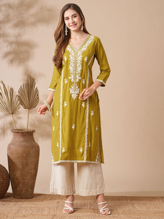 Floral Sequin Embroidered Straight Fit Kurta -...
