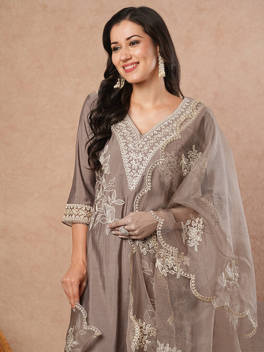 Ethnic Floral Printed & Embroidered A-Line Paneled...