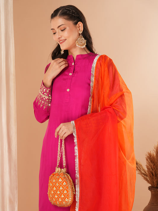 MRP (Inclusive of all taxes)Regular price ₹ 1,759.00₹ 1,759.00 Regular priceUnit price / per₹ 7,399.00Sale priceS M L XL 2XL add to cartSale{"id":7516863004758,"title":"Solid Embroidered Straight Kurta with Pant \u0026 Colorblocked Dupatta - Pink","handle":"solid-embroidered-straight-kurta-with-pant-colorblocked-dupatta-pink","description":"\u003ch1\u003eHighlights\u003c\/h1\u003e\n\u003cp\u003e\u003cbr\u003e-Straight Fit Kurta \u003cbr\u003e-Solid Embroidered at Front\u003cbr\u003e-Comes with Colorblocked Dupatta\u003c\/p\u003e\n\u003ch1\u003eFabric \u0026amp; Colour\u003c\/h1\u003e\n\u003cp\u003e\u003cbr\u003eTop Colour: Pink\u003cbr\u003eTop Fabric: Silk Blend\u003cbr\u003eBottom Colour: Pink\u003cbr\u003eBottom Fabric: Shantoon\u003cbr\u003eDupatta Colour: Multi\u003cbr\u003eDupatta Fabric: Organza\u003c\/p\u003e\n\u003ch1\u003eSpecifications\u003c\/h1\u003e\n\u003cp\u003e\u003cbr\u003eTop Design: Floral print, Abstract print\u003cbr\u003eTop Craft: Embroidery, Plain and Prints\u003cbr\u003eTop Shape: Straight\u003cbr\u003eNeck: Mandarin Collar \u003cbr\u003eSleeve Length: Three-Quarter Sleeves\u003cbr\u003eTop Length: Knee Length\u003cbr\u003eHemline: Straight\u003cbr\u003eSlit: Side Slits\u003c\/p\u003e\n\u003cp\u003eBottom Type: Trousers\u003cbr\u003eBottom Closure: Slip-On\u003cbr\u003eWaistband: Partially Elasticated\u003c\/p\u003e\n\u003cp\u003eDupatta Pattern: Solid \u003cbr\u003eDupatta Border: Taping\u003c\/p\u003e\n\u003cp\u003eWash Care: Dry Clean \u003c\/p\u003e\n\u003cp\u003eLength (in inches)\u003cbr\u003eKurta – 45, Sleeves – 21,\u003cbr\u003eBottom – 40\u003c\/p\u003e\n\u003cp\u003eModel’s Height: 5’7”. Wearing Size S.\u003c\/p\u003e\n\u003ch1\u003eProduct Information\u003c\/h1\u003e\n\u003cp\u003e\u003cbr\u003eManufactured\/Packed\/Marketed By:\u003cbr\u003eFashor Lifestyle Pvt. Ltd.\u003cbr\u003e28\/30, Sudarshanpura Industrial Area,\u003cbr\u003eJaipur - 302006.\u003cbr\u003eCountry of Origin: India\u003c\/p\u003e","published_at":"2025-11-11T10:46:22+05:30","created_at":"2025-02-25T15:53:39+05:30","vendor":"FASHOR","type":"3P Kurta Set","tags":["1001-2000","2001-3000","20199","2XL","All Styles","casualwear","colour_pink","craft_embroidery","craft_plain-and-prints","design_abstract-print","design_floral-print","fabric_silk-blend","festivewear","KURTI","kurtis","meta-size-chart-","now-trending","offer-zone","rakhi","shape_straight"],"price":175900,"price_min":175900,"price_max":175900,"available":true,"price_varies":false,"compare_at_price":739900,"compare_at_price_min":739900,"compare_at_price_max":739900,"compare_at_price_varies":false,"variants":[{"id":42159731212374,"title":"S","option1":"S","option2":null,"option3":null,"sku":"36-ST020199L3FS","requires_shipping":true,"taxable":false,"featured_image":{"id":34113025146966,"product_id":7516863004758,"position":3,"created_at":"2025-02-25T15:54:07+05:30","updated_at":"2025-06-09T18:53:40+05:30","alt":null,"width":1080,"height":1440,"src":"\/\/fashor.com\/cdn\/shop\/files\/29709_8.jpg?v=1749475420","variant_ids":[42148900765782,42148900798550,42148900831318,42148900864086,42159731212374]},"available":false,"name":"Solid Embroidered Straight Kurta with Pant \u0026 Colorblocked Dupatta - Pink - S","public_title":"S","options":["S"],"price":175900,"weight":0,"compare_at_price":739900,"inventory_quantity":0,"inventory_management":"shopify","inventory_policy":"deny","barcode":null,"featured_media":{"alt":null,"id":26544041492566,"position":3,"preview_image":{"aspect_ratio":0.75,"height":1440,"width":1080,"src":"\/\/fashor.com\/cdn\/shop\/files\/29709_8.jpg?v=1749475420"}},"requires_selling_plan":false,"selling_plan_allocations":[],"quantity_rule":{"min":1,"max":null,"increment":1}},{"id":42148900765782,"title":"M","option1":"M","option2":null,"option3":null,"sku":"38-ST020199L3FS","requires_shipping":true,"taxable":false,"featured_image":{"id":34113025146966,"product_id":7516863004758,"position":3,"created_at":"2025-02-25T15:54:07+05:30","updated_at":"2025-06-09T18:53:40+05:30","alt":null,"width":1080,"height":1440,"src":"\/\/fashor.com\/cdn\/shop\/files\/29709_8.jpg?v=1749475420","variant_ids":[42148900765782,42148900798550,42148900831318,42148900864086,42159731212374]},"available":false,"name":"Solid Embroidered Straight Kurta with Pant \u0026 Colorblocked Dupatta - Pink - M","public_title":"M","options":["M"],"price":175900,"weight":0,"compare_at_price":739900,"inventory_quantity":0,"inventory_management":"shopify","inventory_policy":"deny","barcode":null,"featured_media":{"alt":null,"id":26544041492566,"position":3,"preview_image":{"aspect_ratio":0.75,"height":1440,"width":1080,"src":"\/\/fashor.com\/cdn\/shop\/files\/29709_8.jpg?v=1749475420"}},"requires_selling_plan":false,"selling_plan_allocations":[],"quantity_rule":{"min":1,"max":null,"increment":1}},{"id":42148900798550,"title":"L","option1":"L","option2":null,"option3":null,"sku":"40-ST020199L3FS","requires_shipping":true,"taxable":false,"featured_image":{"id":34113025146966,"product_id":7516863004758,"position":3,"created_at":"2025-02-25T15:54:07+05:30","updated_at":"2025-06-09T18:53:40+05:30","alt":null,"width":1080,"height":1440,"src":"\/\/fashor.com\/cdn\/shop\/files\/29709_8.jpg?v=1749475420","variant_ids":[42148900765782,42148900798550,42148900831318,42148900864086,42159731212374]},"available":false,"name":"Solid Embroidered Straight Kurta with Pant \u0026 Colorblocked Dupatta - Pink - L","public_title":"L","options":["L"],"price":175900,"weight":0,"compare_at_price":739900,"inventory_quantity":0,"inventory_management":"shopify","inventory_policy":"deny","barcode":null,"featured_media":{"alt":null,"id":26544041492566,"position":3,"preview_image":{"aspect_ratio":0.75,"height":1440,"width":1080,"src":"\/\/fashor.com\/cdn\/shop\/files\/29709_8.jpg?v=1749475420"}},"requires_selling_plan":false,"selling_plan_allocations":[],"quantity_rule":{"min":1,"max":null,"increment":1}},{"id":42148900831318,"title":"XL","option1":"XL","option2":null,"opt