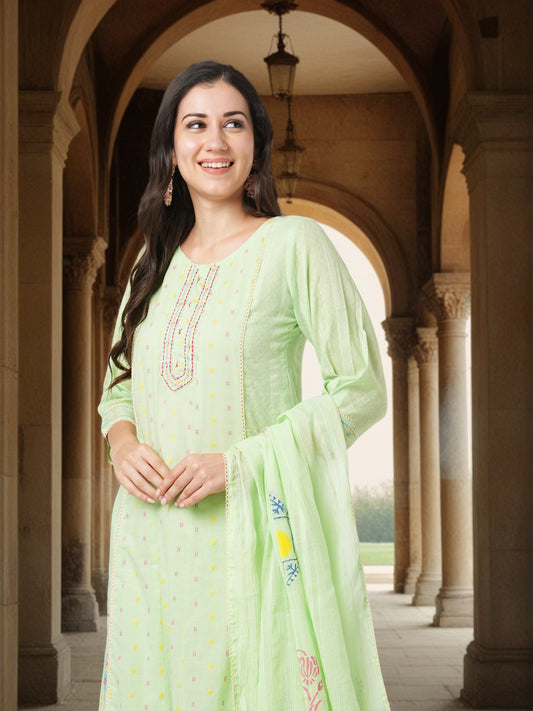 MRP (Inclusive of all taxes)Regular price ₹ 2,599.00₹ 2,599.00 Regular priceUnit price / per₹ 2,599.00Sale priceM L XL 2XL add to cart{"id":7586184527958,"title":"Solid Ethnic Woven A-Line Paneled Kurta with Pant \u0026 Dupatta - Light Green","handle":"solid-ethnic-woven-a-line-paneled-kurta-with-pant-dupatta-light-green","description":"\u003ch1\u003eHighlights\u003c\/h1\u003e\n\u003cp\u003e\u003cbr\u003e-Embrace timeless elegance with this Solid Ethnic Woven A-Line Paneled Kurta with Pant \u0026amp; Dupatta in soothing light green. Featuring all-over ethnic weaving, the kurta is adorned with delicate beads and kantha work on the front. Paired with a solid pant and an ethnic printed dupatta accented with crochet lace, this set brings together tradition and refined craftsmanship.\u003c\/p\u003e\n\u003ch1\u003eFabric \u0026amp; Colour\u003c\/h1\u003e\n\u003cp\u003e\u003cbr\u003eTop Colour: Green\u003cbr\u003eTop Fabric: Cotton\u003cbr\u003eBottom Colour: Green\u003cbr\u003eBottom Fabric: Cotton Blend\u003cbr\u003eDupatta Colour: Green\u003cbr\u003eDupatta Fabric: Cotton Blend\u003c\/p\u003e\n\u003ch1\u003eSpecifications\u003c\/h1\u003e\n\u003cp\u003e\u003cbr\u003eTop Design: Solid\u003cbr\u003eTop Craft: Embroidery, Plain and Prints\u003cbr\u003eTop Shape: A-line\u003cbr\u003eNeck: Round Neck\u003cbr\u003eSleeve Length: Three-Quarter Sleeves\u003cbr\u003eTop Length: Calf Length\u003cbr\u003eHemline: Flared\u003cbr\u003eSlit: Side Slits\u003c\/p\u003e\n\u003cp\u003eBottom Type: Trousers\u003cbr\u003eBottom Closure: Slip-On\u003cbr\u003eWaistband: Partially Elasticated\u003c\/p\u003e\n\u003cp\u003eDupatta Pattern: Printed\u003cbr\u003eDupatta Border: Taping\u003c\/p\u003e\n\u003cp\u003eWash Care: Hand Wash\u003c\/p\u003e\n\u003cp\u003eLength (in inches)\u003cbr\u003eKurta – 45, Sleeves – 17,\u003cbr\u003eBottom – 38\u003c\/p\u003e\n\u003cp\u003eModel’s Height: 5’7”. Wearing Size S.\u003c\/p\u003e\n\u003ch1\u003eProduct Information\u003c\/h1\u003e\n\u003cp\u003e\u003cbr\u003eManufactured\/Packed\/Marketed By:\u003cbr\u003eFashor Lifestyle Pvt. Ltd.\u003cbr\u003e28\/30, Sudarshanpura Industrial Area,\u003cbr\u003eJaipur - 302006.\u003cbr\u003eCountry of Origin: India\u003c\/p\u003e","published_at":"2025-12-04T11:30:45+05:30","created_at":"2025-07-05T07:02:19+05:30","vendor":"FASHOR","type":"3P Kurta Set","tags":["2001-3000","28257","2XL","All Styles","bs","casualwear","colour_Green","craft_embroidery","craft_plain-and-prints","design_solid","fabric_cotton","festivewear","KURTI","kurtis","meta-size-chart-","now-trending","shape_a-line","workwear"],"price":259900,"price_min":259900,"price_max":259900,"available":true,"price_varies":false,"compare_at_price":259900,"compare_at_price_min":259900,"compare_at_price_max":259900,"compare_at_price_varies":false,"variants":[{"id":42452112605270,"title":"M","option1":"M","option2":null,"option3":null,"sku":"38-ST028257A5OS","requires_shipping":true,"taxable":false,"featured_image":{"id":34646318809174,"product_id":7586184527958,"position":4,"created_at":"2025-07-05T07:02:59+05:30","updated_at":"2025-07-05T07:04:06+05:30","alt":null,"width":1080,"height":1440,"src":"\/\/fashor.com\/cdn\/shop\/files\/30945_9.jpg?v=1751679246","variant_ids":[42452112605270,42452112638038,42452112670806,42452112703574]},"available":false,"name":"Solid Ethnic Woven A-Line Paneled Kurta with Pant \u0026 Dupatta - Light Green - M","public_title":"M","options":["M"],"price":259900,"weight":0,"compare_at_price":259900,"inventory_quantity":0,"inventory_management":"shopify","inventory_policy":"deny","barcode":"","featured_media":{"alt":null,"id":26922558488662,"position":4,"preview_image":{"aspect_ratio":0.75,"height":1440,"width":1080,"src":"\/\/fashor.com\/cdn\/shop\/files\/30945_9.jpg?v=1751679246"}},"requires_selling_plan":false,"selling_plan_allocations":[],"quantity_rule":{"min":1,"max":null,"increment":1}},{"id":42452112638038,"title":"L","option1":"L","option2":null,"option3":null,"sku":"40-ST028257A5OS","requires_shipping":true,"taxable":false,"featured_image":{"id":34646318809174,"product_id":7586184527958,"position":4,"created_at":"2025-07-05T07:02:59+05:30","updated_at":"2025-07-05T07:04:06+05:30","alt":null,"width":1080,"height":1440,"src":"\/\/fashor.com\/cdn\/shop\/files\/30945_9.jpg?v=1751679246","variant_ids":[42452112605270,42452112638038,42452112670806,42452112703574]},"available":false,"name":"Solid Ethnic Woven A-Line Paneled Kurta with Pant \u0026 Dupatta - Light Green - L","public_title":"L","options":["L"],"price":259900,"weight":0,"compare_at_price":259900,"inventory_quantity":0,"inventory_management":"shopify","inventory_policy":"deny","barcode":"","featured_media":{"alt":null,"id":26922558488662,"position":4,"preview_image":{"aspect_ratio":0.75,"height":1440,"width":1080,"src":"\/\/fashor.com\/cdn\/shop\/files\/30945_9.jpg?v=1751679246"}},"requires_selling_plan":false,"selling_plan_allocations":[],"quantity_rule":{"min":1,"max":null,"increment":1}},{"id":42452112670806,"title":"XL","option1":"XL","option2":null,"option3":null,"sku":"42-ST028257A5OS","requires_shipping":true,"taxable":false,"featured_image":{"id":34646318809174,"product_id":7586184527958,"position":4,"created_at":"2025-07-05T07:02:59+05:30","updated_at":"2025-07-05T07:04:06+05:30","alt":null,"width":1080,"height":1440,"src":"\/\/fashor.com\/cdn\/shop\/files\/30945_9.jpg?v=1751679246","variant_ids":[42452112605270,42452112638038,42452112670806,42452112703574]},"available":false,"name":"Solid Ethnic Woven A-Line Paneled Kurta with Pant \u0026 Dupatta - Light Green - XL","public_title":"XL","options":["XL"],"price":259900,"weight":0,"compare_at_price":259900,"inventory_quantity":0,"inventory_management":"shopify","inventory_policy":"deny","barcode":"","featured_media":{"alt":null,"id":26922558488662,"position":4,"preview_image":{"aspect_ratio":0.75,"height":1440,"width":1080,"src":"\/\/fashor.com\/cdn\/shop\/files\/30945_9.jpg?v=1751679246"}},"requires_selling_plan":false,"s