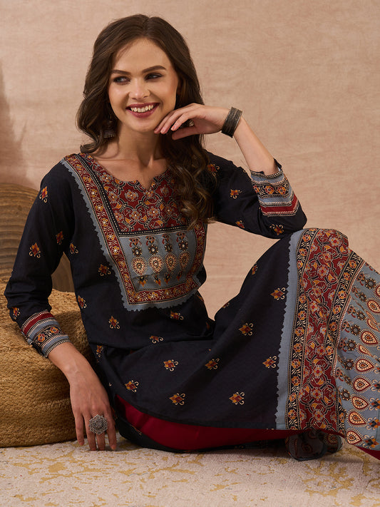 Ethnic Floral Printed Embroidered Straight Fit Kurta...