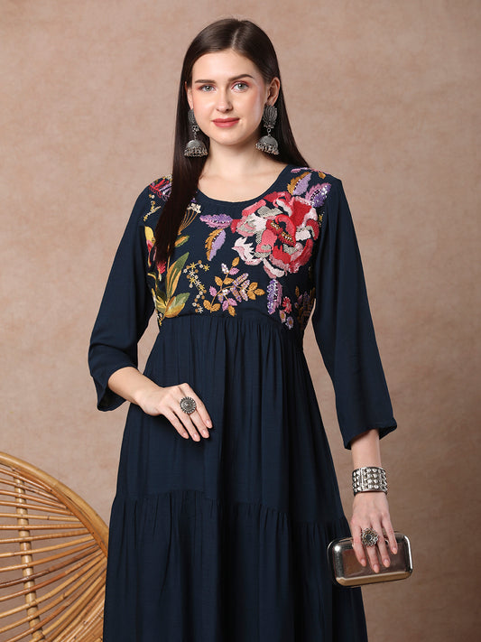 Solid Floral Threadwork Embroidered A-Line Tiered Kurta...