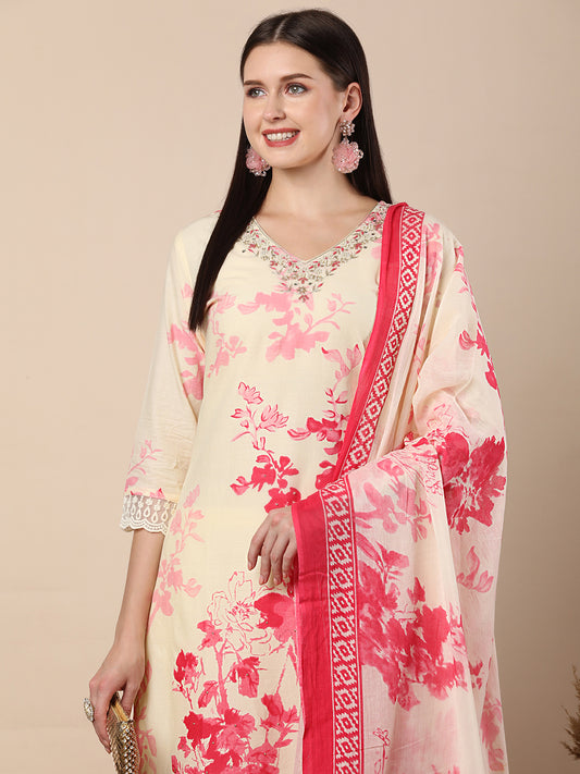 Abstract Floral Stripes Printed & Embroidered Straight...