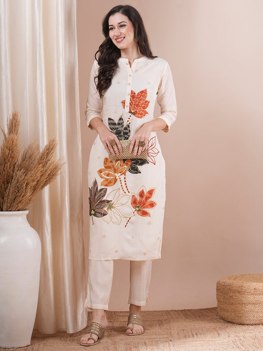 Abstract Floral Printed Embroidered Straight Fit Co-ord...