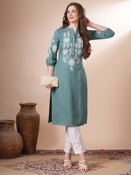 Solid Floral Embroidered Straight Fit Kurta -...