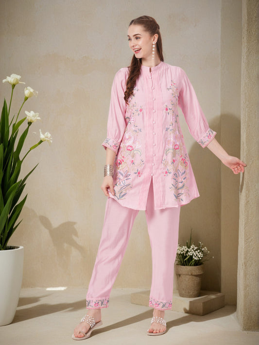 Solid Floral Embroidered Pin Tucked A-Line Co-ord...